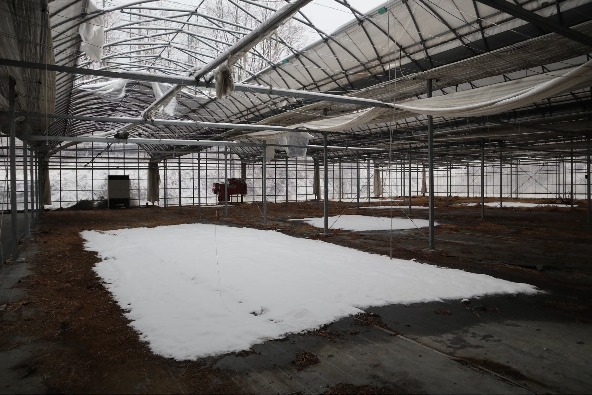 今年2月の大雪と3月の突風により、約7,000本のイチゴ苗を育てていたビニールハウスが崩壊しました。
