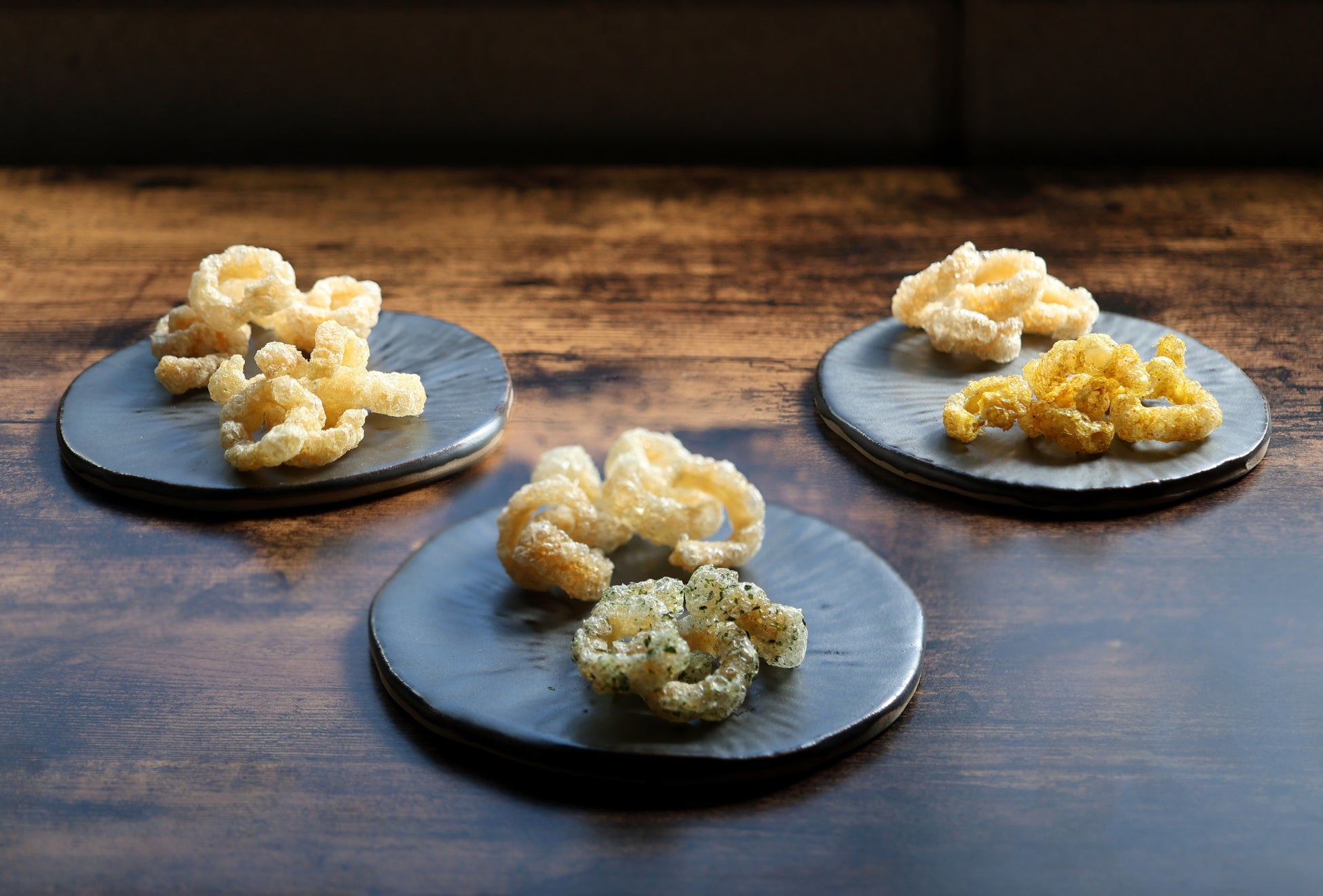 東京風アンダカシーは豚皮(トンピ)をこめ油で丁寧に揚げることで軽くてサクサクな食感に仕上げることに成功しました。もう「揚げカス」なんて言わせません。皆さまに愛されるお菓子、おつまみになりました。