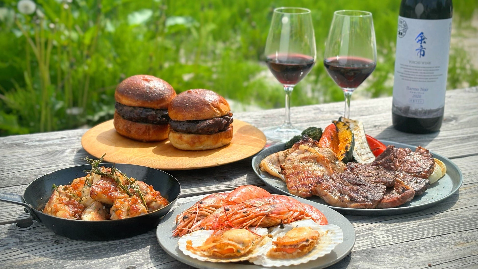 また、BBQの内容もより充実し、全てのコースで余市のブランド豚「北島豚」や余市産の鹿肉が味わえるようになりました。地元食材とのペアリングにより、余市のお酒をより一層おいしく楽しむことができます。さらに、今年は貸切制のバレルサウナを設営中。空を見上げ、川のせせらぎを聞きながらととのってください。