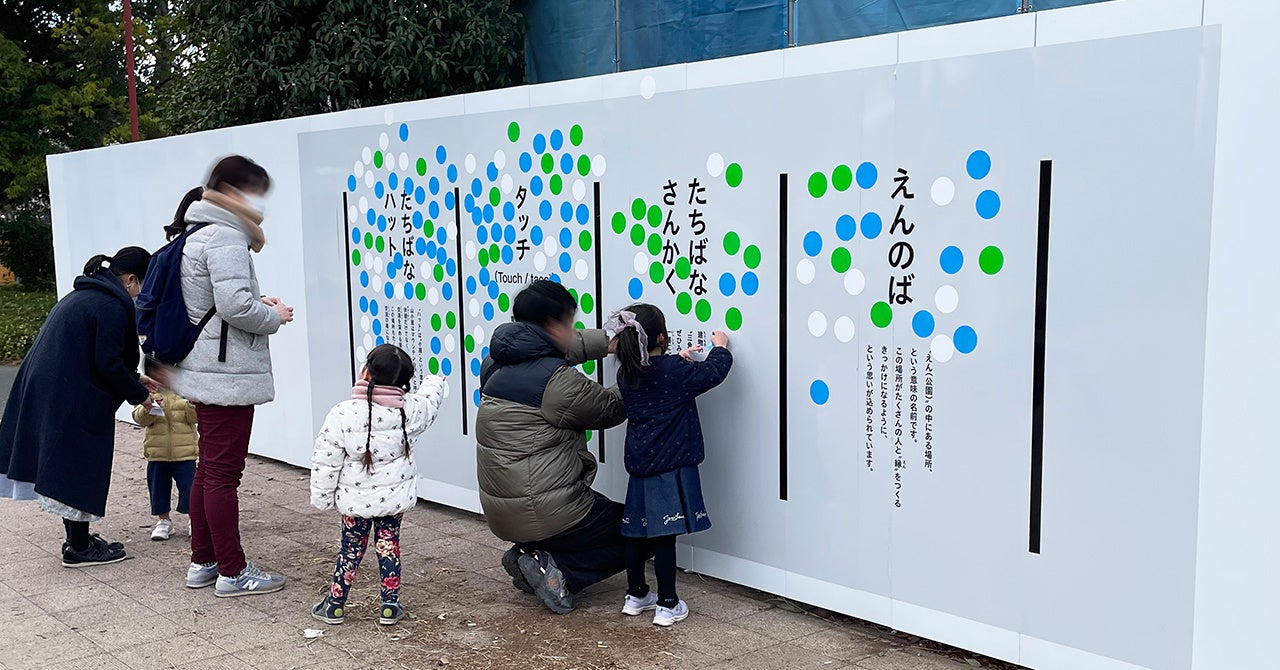 名称を決める際も、実際に公園を利用する方が参加できるよう投票の場を設けました。工事の仮囲いに名称案を掲示しシールを貼ってもらうというもので、「TACHIBANA HUT」に決定。“HUT”は小屋を意味し、山小屋が英語で「マウンテンハット」と呼ばれ休憩だけでなく登山者同士が交流を深める場であるように、TACHIBANA HUTもたくさんの人の交流の場になることを期待しています。