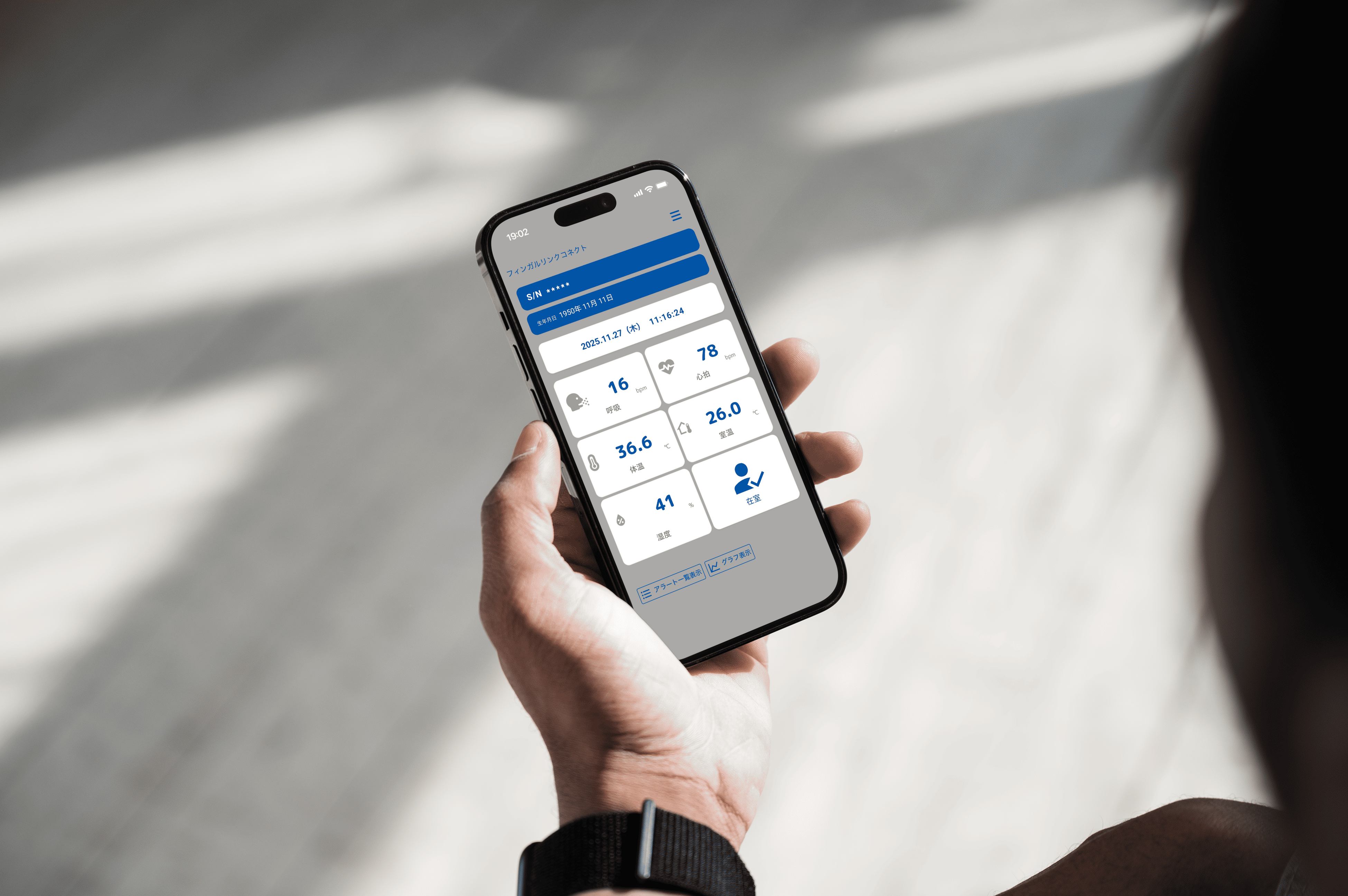 「フィンガルリンクコネクト」は、最先端のミリ波レーダー生体情報検出技術を搭載。カメラを使用せず、心拍・呼吸・体温を非接触で24時間リアルタイム検知します。