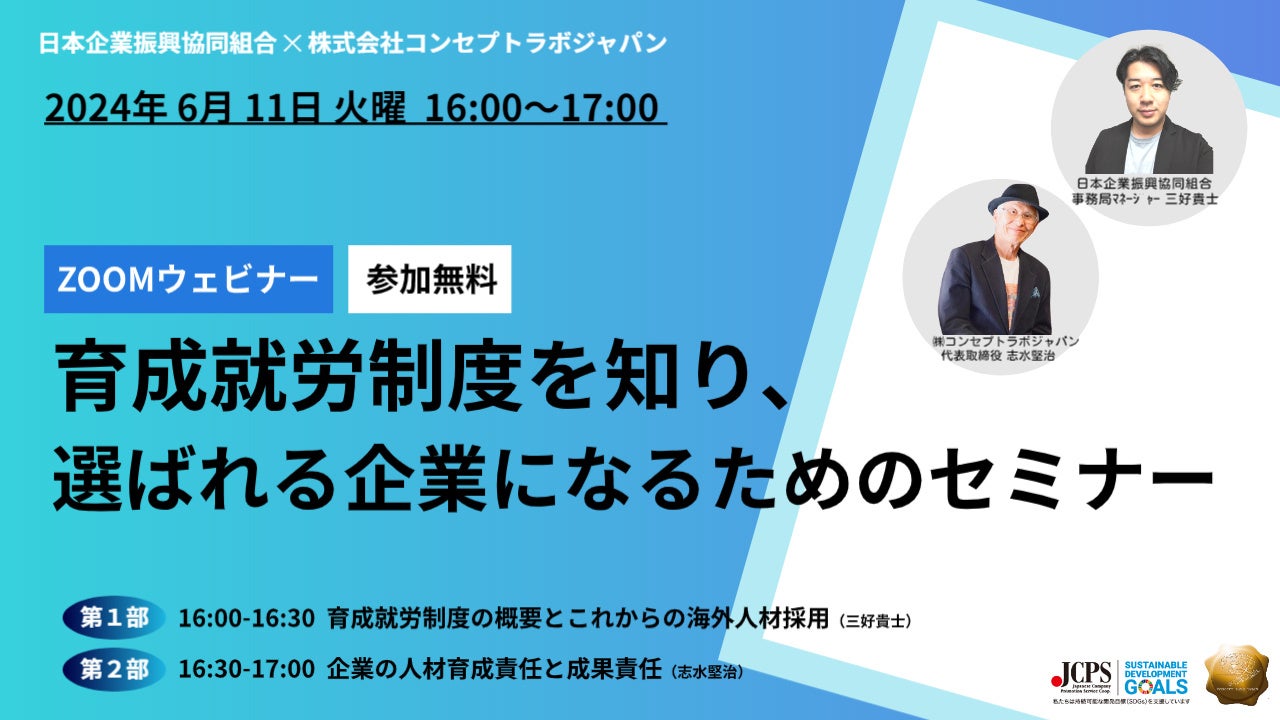 日本企業振興協同組合は、株式会社コンセプトラボジャパン代表 志水堅治氏をゲストに迎え、「育成就労制度を知り、選ばれる企業になる」をテーマとしたウェビナーを6月11日(火)16:00より無料開催します。