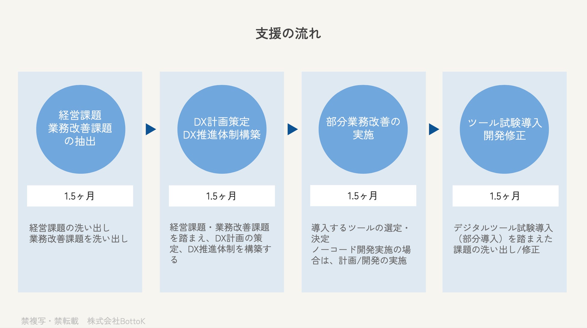 株式会社BottoKでは昨年度に当事業を受託、県内企業4社への支援を実施。異なる業種、会社規模の違いがある中、各企業の課題の洗い出しからスタートしました。企業が抱える課題、IT環境などによりDXの進行スピードが異なるため、それぞれに合った支援内容を提供してまいりました。