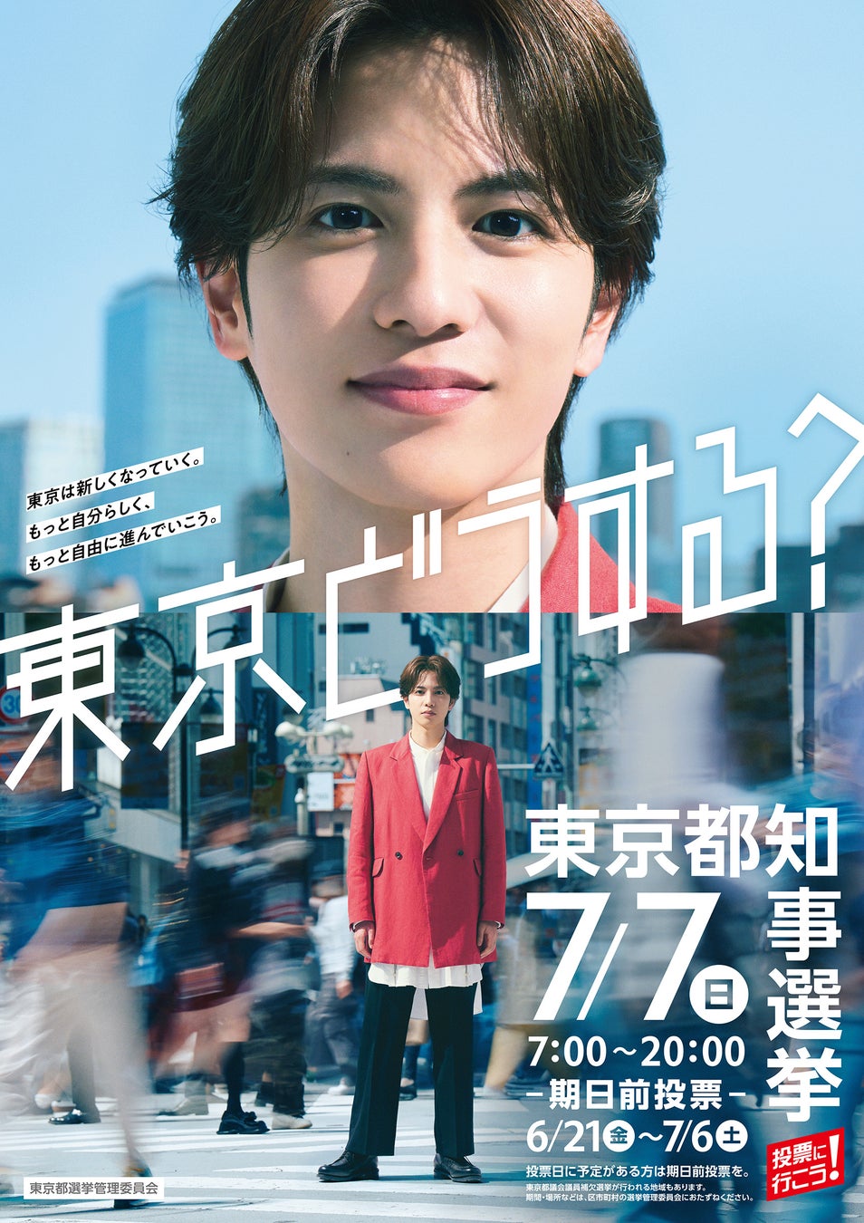 東京都選挙管理委員会は、7月7日執行の東京都知事選挙のイメージキャラクターに、ドラマ等で若い世代を中心に幅広い知名度をもつ、志尊淳(しそん じゅん)さんを起用しました。東京の高層ビル群と行き交う人々を背景に、まっすぐな眼差しで「東京どうする?」と呼びかけるポスターデザインも決定しました。