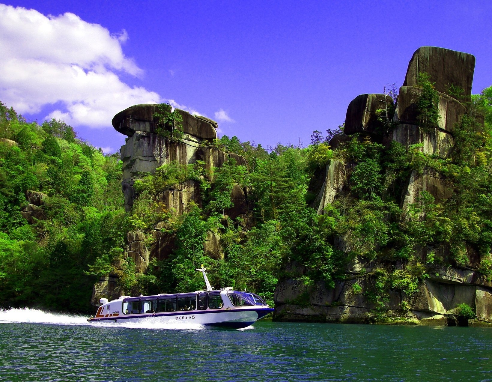 約100年前に木曽川を大井ダムでせき止めたためにできた人造湖です。乗船場からは、渓谷を巡る遊覧船が発着し、ダム建設以前の急流を彷彿とさせる湖畔の奇岩や絶壁が観覧できます。