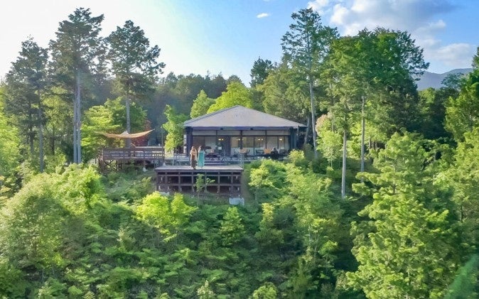 小高い山頂にある絶景カフェ。店主こだわりのオーガニック食材を使用した優しいメニューを味わうことができます。森の中に静かに佇む、癒しの非日常空間です。
