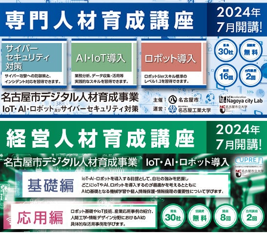 名古屋市・名古屋工業大学・名古屋市立大学の連携事業です。名古屋工業大学にて技術者向けの「専門人材育成講座」を、名古屋市立大学にて経営者向けの「経営人材育成講座」をそれぞれ開催します。