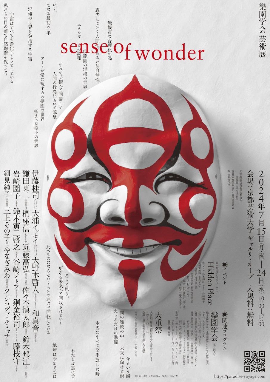 人と社会の意識変容を目的に、研究者達が分野ごとに分かれ研究を進める樂園学会は、研究だけでなく実践の場として、この度、アートにおける樂園をテーマとした芸術展「sense of wonder」を2024年7月15日(月)〜24日(水)、京都芸術大学「ギャルリ・オーブ」にて開催します。