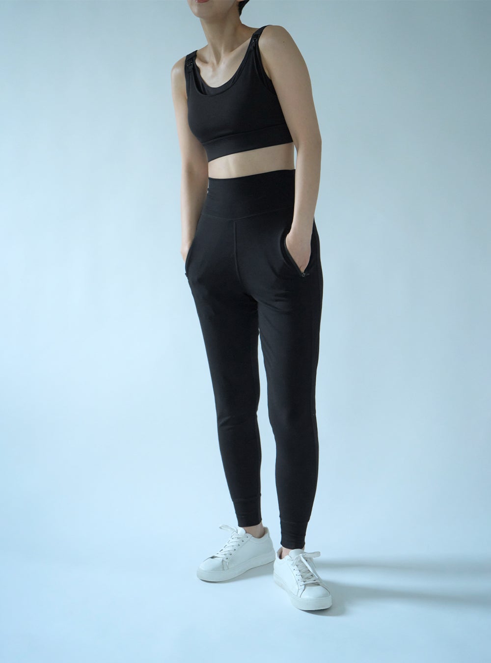 美脚効果があるジョガーパンツ。産後の気になるぽっこりお腹・おしり・太もものラインをカバーしてくれるデザイン。両手が自由になるように大きめのジッパー付きポケットあり。(ブラックのみ、S・M・L)