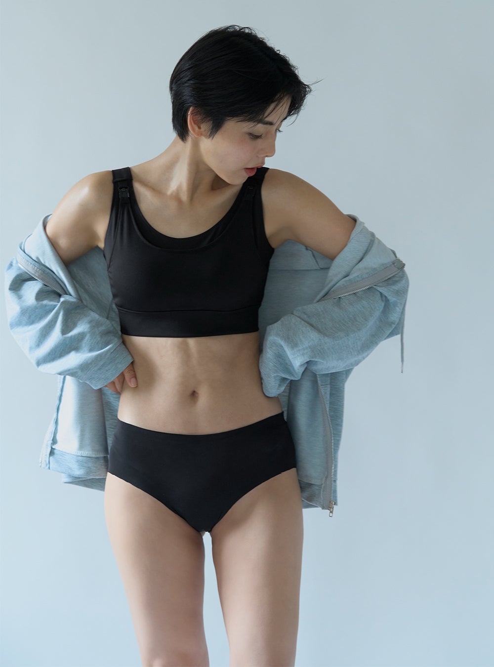 授乳用とは思えないデザインとそのホールド感にこだわりあり。ストラップ部分のホックを外し、カップ部分を開いてスムーズに授乳可能。子連れヨガ、子連れピラティス、自宅でのトレーニング中など赤ちゃんを待たせることなく授乳可能。(白黒2色、S・M・L)