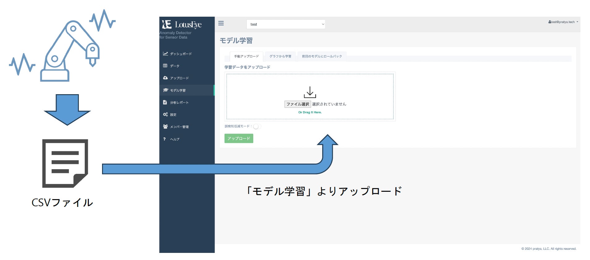 LotusEyeは業界初※のフリーミアム型AI異常検知サービスで、センサーデータを用いたAI異常検知を誰でも無料で始めることができます。従来はハードルの高かったAIモデルの作成についても、CSV形式の時系列センサーデータをアップロードするだけで簡単におこなうことが可能です。