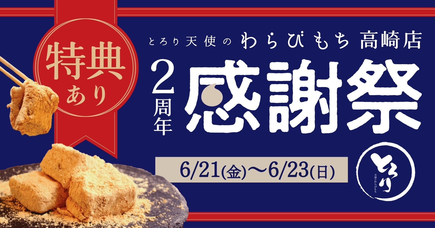 【2周年感謝祭開催】『とろり天使のわらびもち 高崎店』が6/21(金)〜6/23(日)で、2周年感謝祭を開催!お得なキャンペーンに注目!
