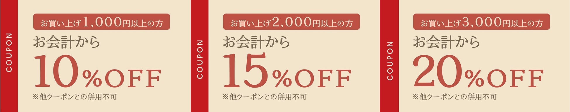 【内容】1000円以上購入で10%OFF/1500円以上購入で15%OFF/2000円以上購入で20%OFF