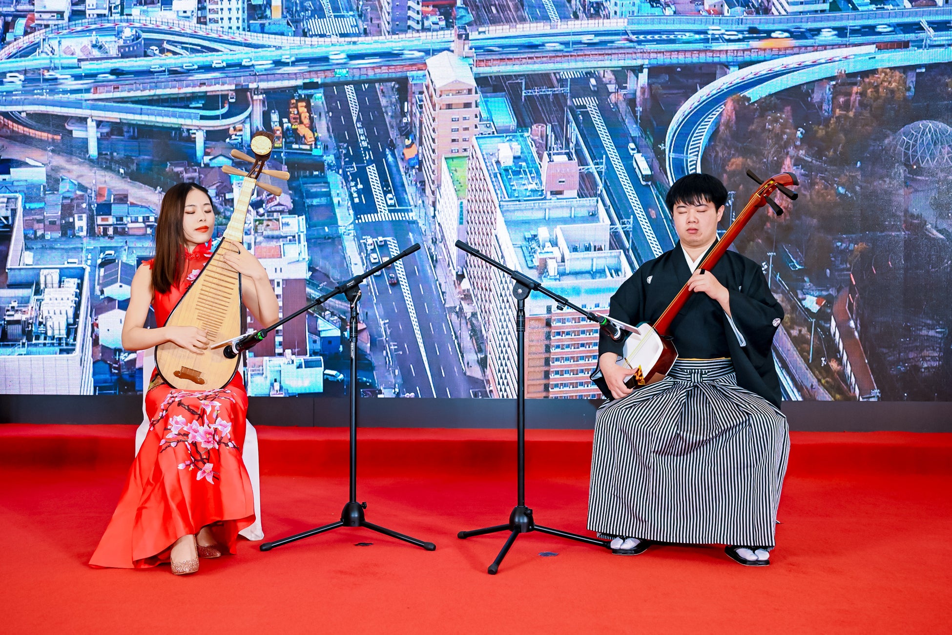 交流会は素晴らしい和太鼓の演奏で始まり、力強い太鼓の音が来場者の心に深く刻まれ、文化交流における日中友好の堅固な発展を印象づけた。また中国文化の代表的な楽器である琵琶と日本文化の代表的な楽器である三味線の独奏とアンサンブルの演奏は、両国文化の奥深い伝統と独特の魅力を示し、参加者はその美しいハーモニーに酔いしれた。さらに、今回は特別に茅台酒の高級ワインと白酒がゲストにふるまわれ、日本の会席料理との食のマリアージュを演出。音楽と食の多重にわたる文化交流を感じながら来場者は50年の歴史に思いを馳せた。