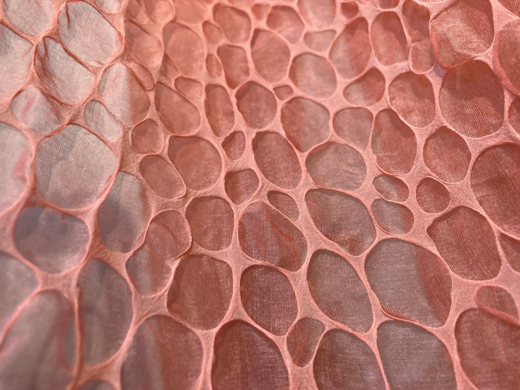 この「3Dシルク」は、伝統的なシルク織物技術と現代的な立体構造を融合させたもので、その独自性は他に類を見ません。「妖精の羽シリーズ※2」としても知られ、美しい光沢と触り心地の良さに加え、視覚的なインパクトも強く、多くのファッションデザイナーや業界関係者から高い評価を受けました。