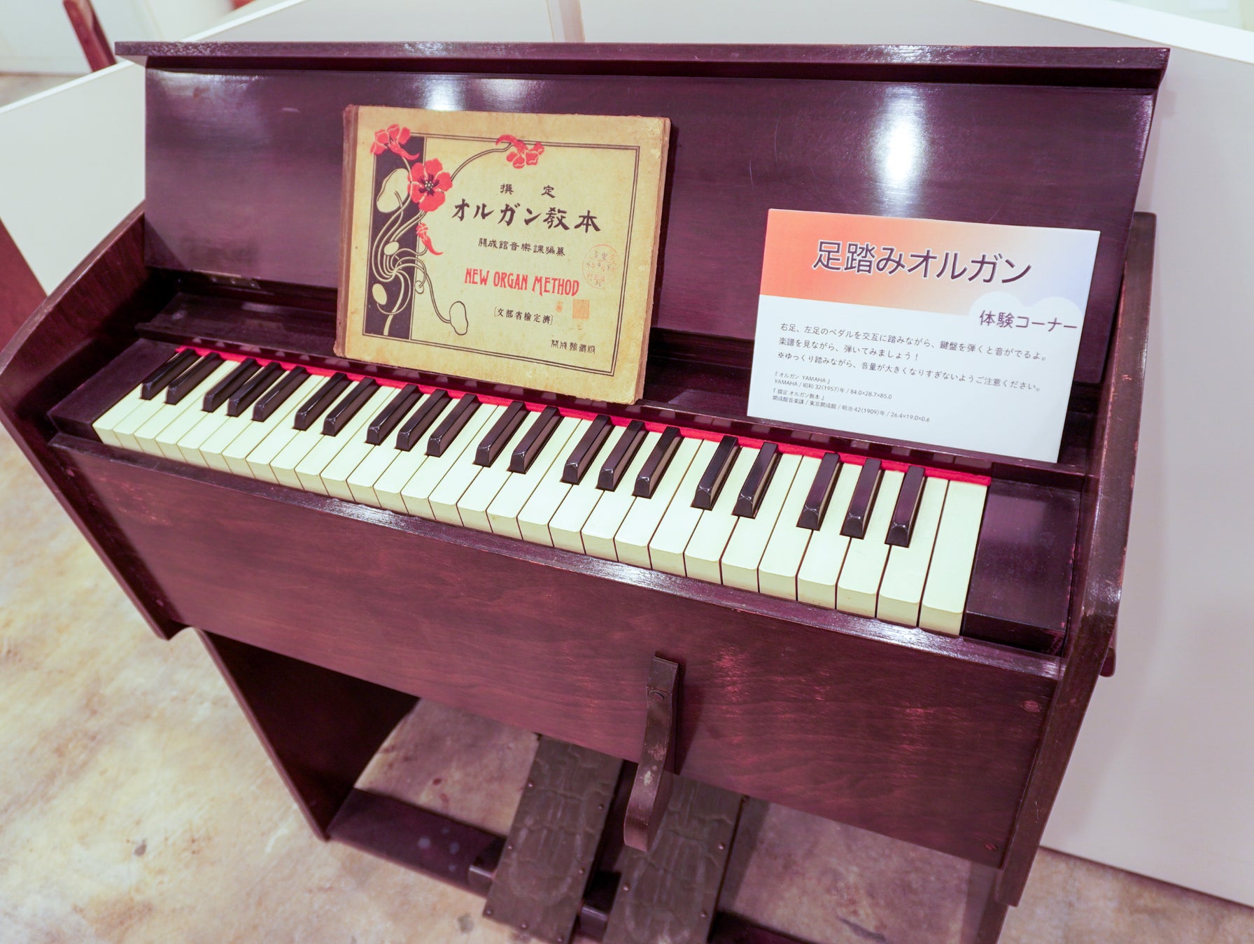 まずは、足踏みオルガンです。足のペダルを踏みながら演奏するオルガンで、明治時代のオルガン教本を演奏してみましょう。右足と左足のペダルを交互に踏みながら演奏するという、独特の演奏方法がくせになること間違いなし。教本にはおなじみの曲も掲載されているので、探してみてください。