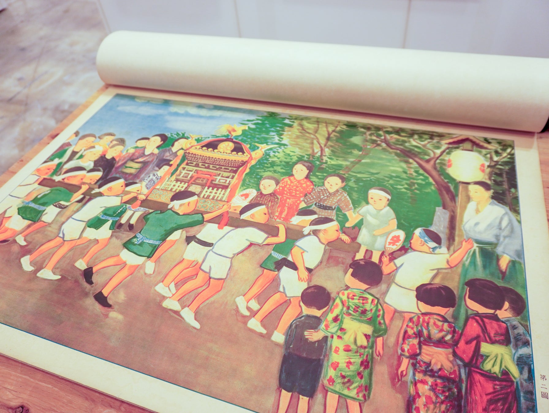 さらに、教育掛図も実際にめくって中を見ることができます。教育掛図とは、教室の黒板や壁面に掛けて使われた大判の絵や図表で、明治時代に欧米の教育を参考に取り入れられた教具です。広く普及したにもかかわらず、現存する掛図は多くありません。数少ない保存状態の良い掛図を月替わりで展示いたしますので、ぜひ何度も足を運んでご覧ください。ほかにも、そろばんや昔流行したおもちゃなども触ることができます。