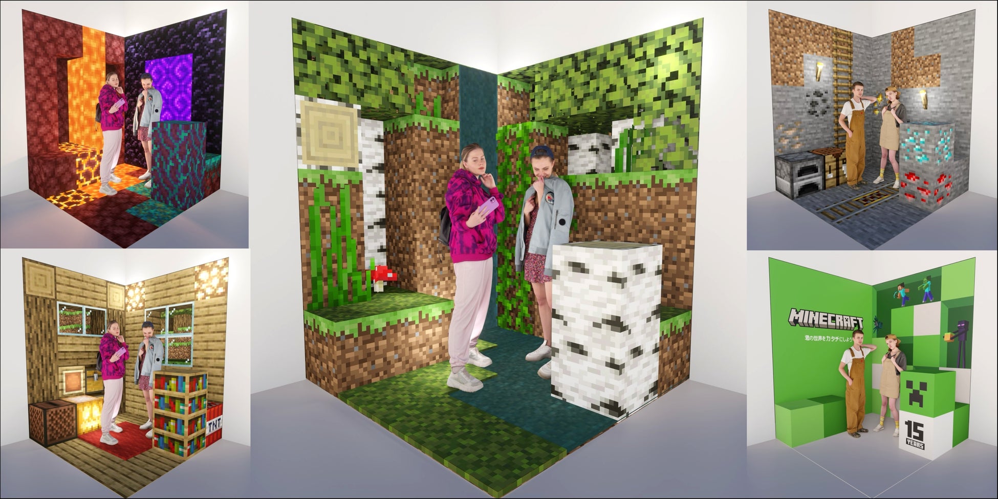 直近では、Minecraft 15周年を記念したポップアップストアイベント(2024年4-5月 / 渋谷PARCO)にて、Minecraftの世界に入り込んだような体験ができる立体型LEDを活用した没入型のイマーシブ・デジタルフォトブースを開発し、提供いたしました。