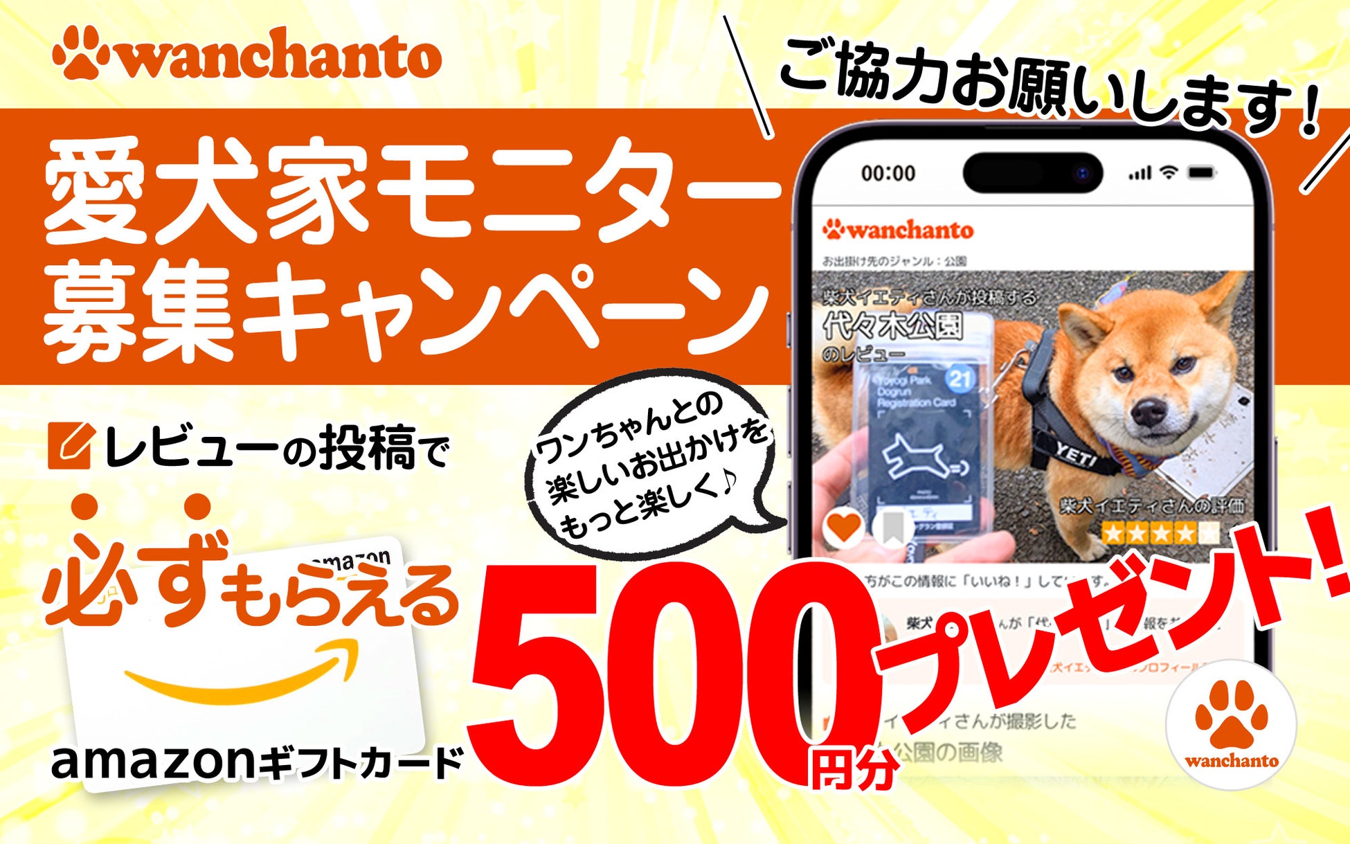 【レビュー1投稿で500円分のギフトカードプレゼント】愛犬家モニター募集キャンペーン開催のお知らせ / ワンちゃんとのお出かけ口コミサイト「ワンちゃんと(wanchanto.info)