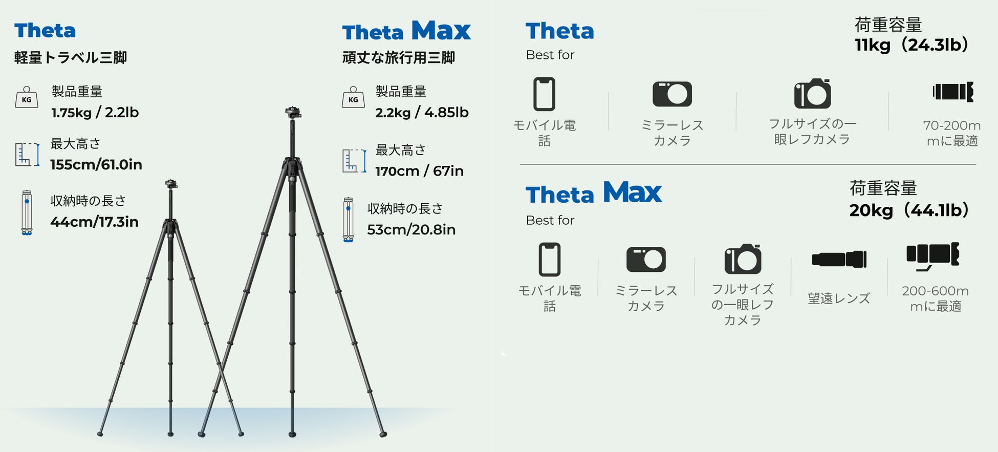 写真家さん達にとって、三脚を選ぶ際に最も重要な要素は大きさと重量です。現在世の中に出回っている旅行用三脚、軽くて頑丈にする為に、ほとんどの物が大きすぎる作りになってしまっています。逆に、軽くてコンパクトにする為に頑丈さを犠牲にしている物も見受けられます。ちょうどいい物がなありませんでした。そこで私達は革新を起こしてThetaを開発しました。3つの要素全てを考慮した高性能三脚を作りました。丸いチューブのデザインを維持しながら、無駄なスペースをなくす為に、中央のシャフト構造を最適化しました。独自のセンターコラムデザインと、上部の脚の直径を29mmに太くすることで、安定性と能力が他にはないレベルまで高まっています。