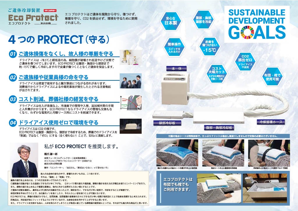 ドライアイスはC02の塊です、Eco Protectは腹部・胸部・頭部を約―15℃に冷却する為、葬儀でのドライアイスを「削減」ではなく「ゼロ」にする(全く使わない)ことで、SDGsに貢献します。