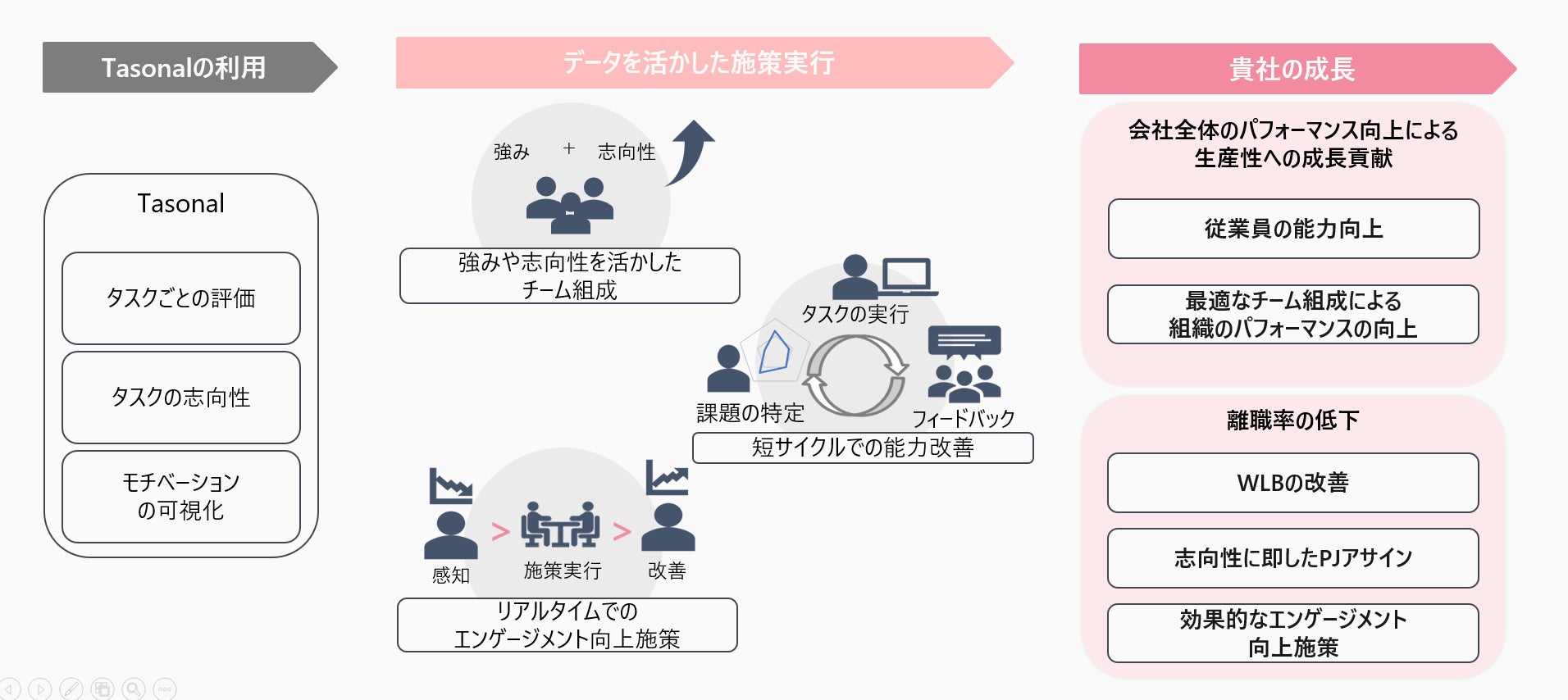「Tasonal」はタスク管理ツール上で評価やエンゲージメントを収集し、メンバーそれぞれの強みや志向性を可視化します。集まったデータを利用し、強みや志向性を活かしたチーム組成や、短いサイクルでのフィードバックによる能力改善、リアルタイムでのエンゲージメント向上などの施策の実行を可能とします。
