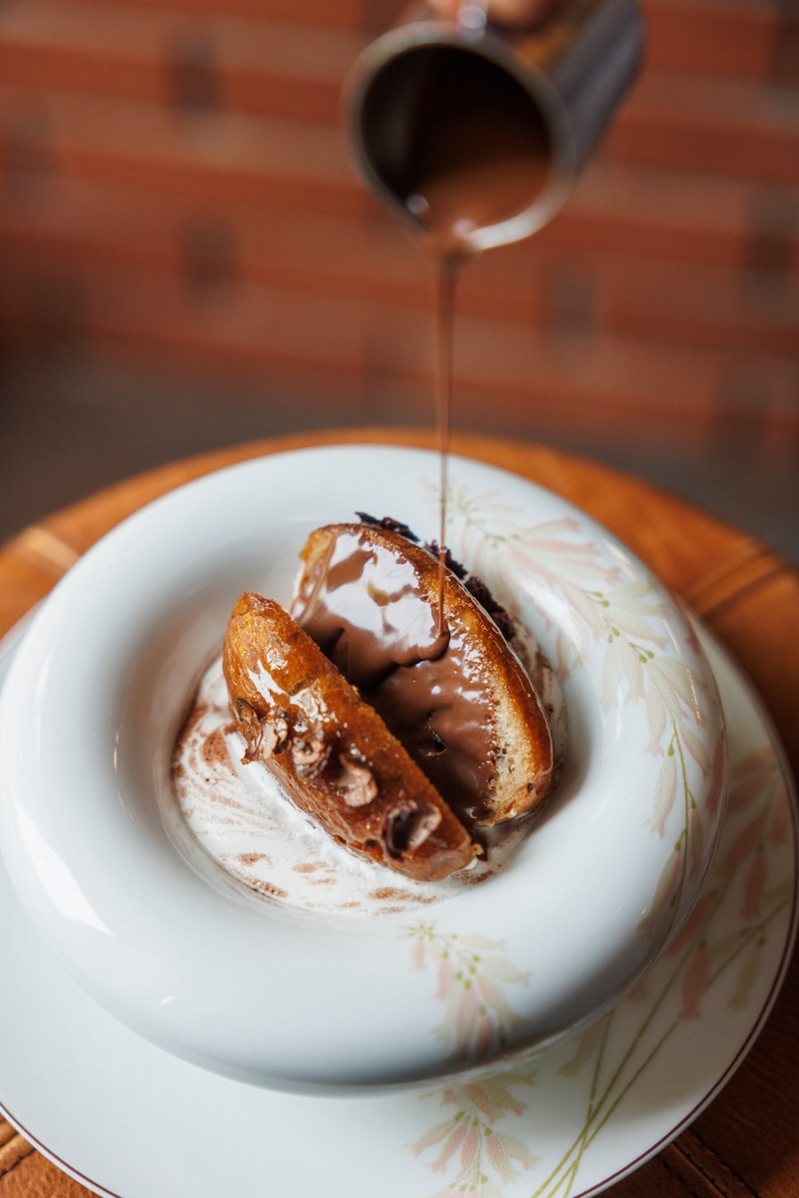 カカオニブを混ぜ込み、カカオポッドの形にふんわりと焼き上げた生地を、カカオニブやオレンジとレモンのゼストで香り付けしたラム酒のシロップに漬け込み、ふわふわのクリームにのせました。その下には、ラム酒香る滑らかなショコラ(ペルー産カカオ75%)のクリームとヘーゼルナッツとカカオニブを合わせたザクザクのショコラ(マダガスカル産カカオ75%)を忍ばせ、仕上げに濃厚なのショコラソースをかけてお召し上がりいただきます。