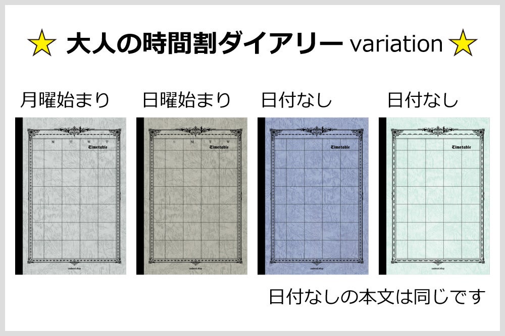 新作の「大人の時間割ダイアリー」は、月曜始まり・日曜始まり・曜日なしの3種類のフォーマット。