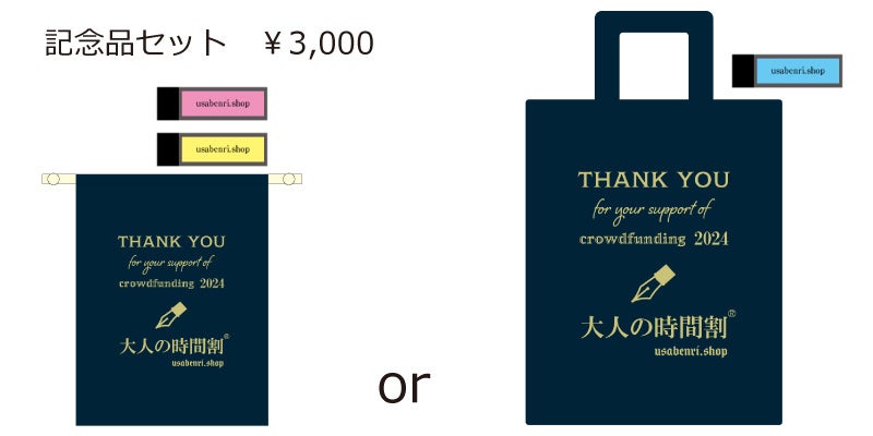 さらにご支援のリターンは、大人の時間割ダイアリーとともに、大人の時間割の使い方のアイディア集や、限定巾着やエコバッグなどのノベルティ付きとなっている。