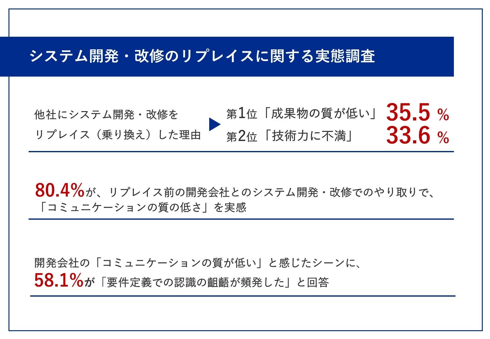 【システム開発・改修のリプレイス企業担当者に聞く】8割強が「元々の開発会社のコミュニケーションの質の低さ」を実感!リプレイス理由、第2位「技術力に不満」を抑え、第1位は・・?