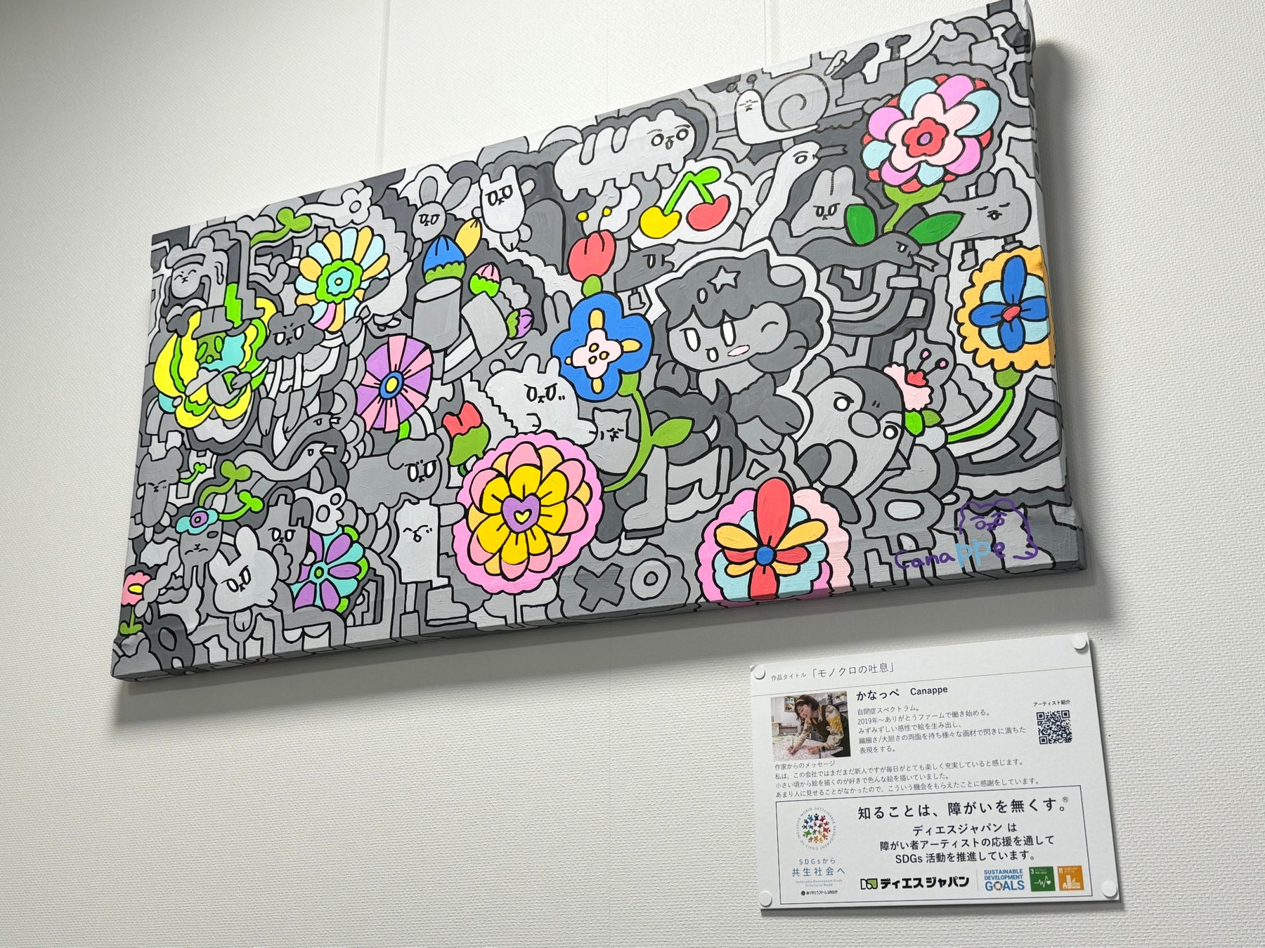 ウィズダイバーシティに加盟している岡山の株式会社ありがとうファームには、20名以上のハンディキャップアーティストが活躍しています。東京ディエスジャパンの本社会議室にありがとうファームのアーティスト作品を展示しているほか、一部社員の名刺裏にもアートを印刷しています。