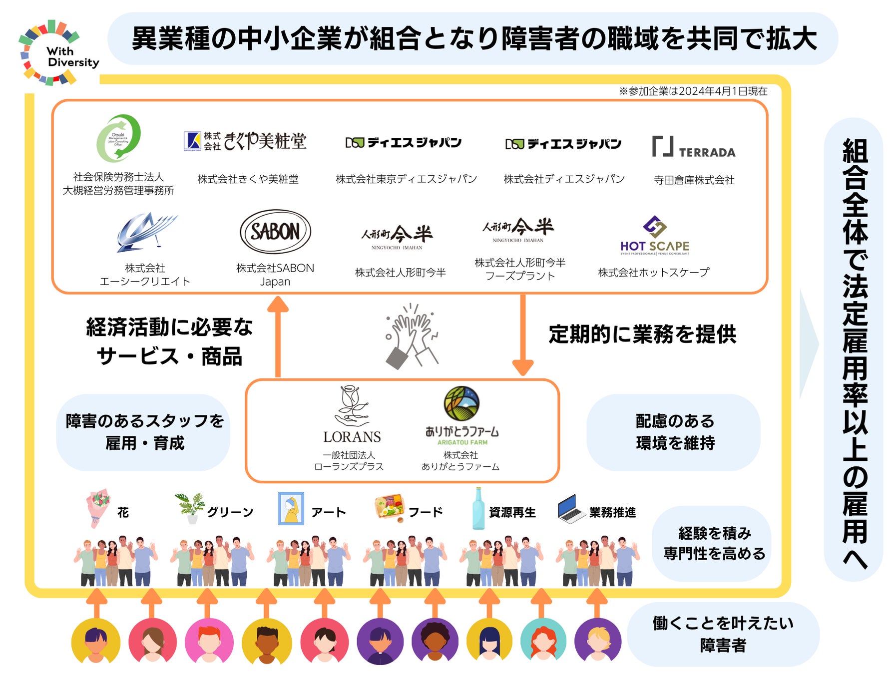 株式会社ディエスジャパン(本社:大阪府東大阪市、代表取締役社長:北條陽子 以下「ディエスジャパン」)は、障害者雇用を推進していきたい中小企業と障害福祉団体が企業の垣根をこえて参加し、障害者の職域を共同で拡大することを目指して設立されたウィズダイバーシティ有限責任事業組合(LLP)(東京都渋谷区、以下「ウィズダイバーシティ」)に参加しています。