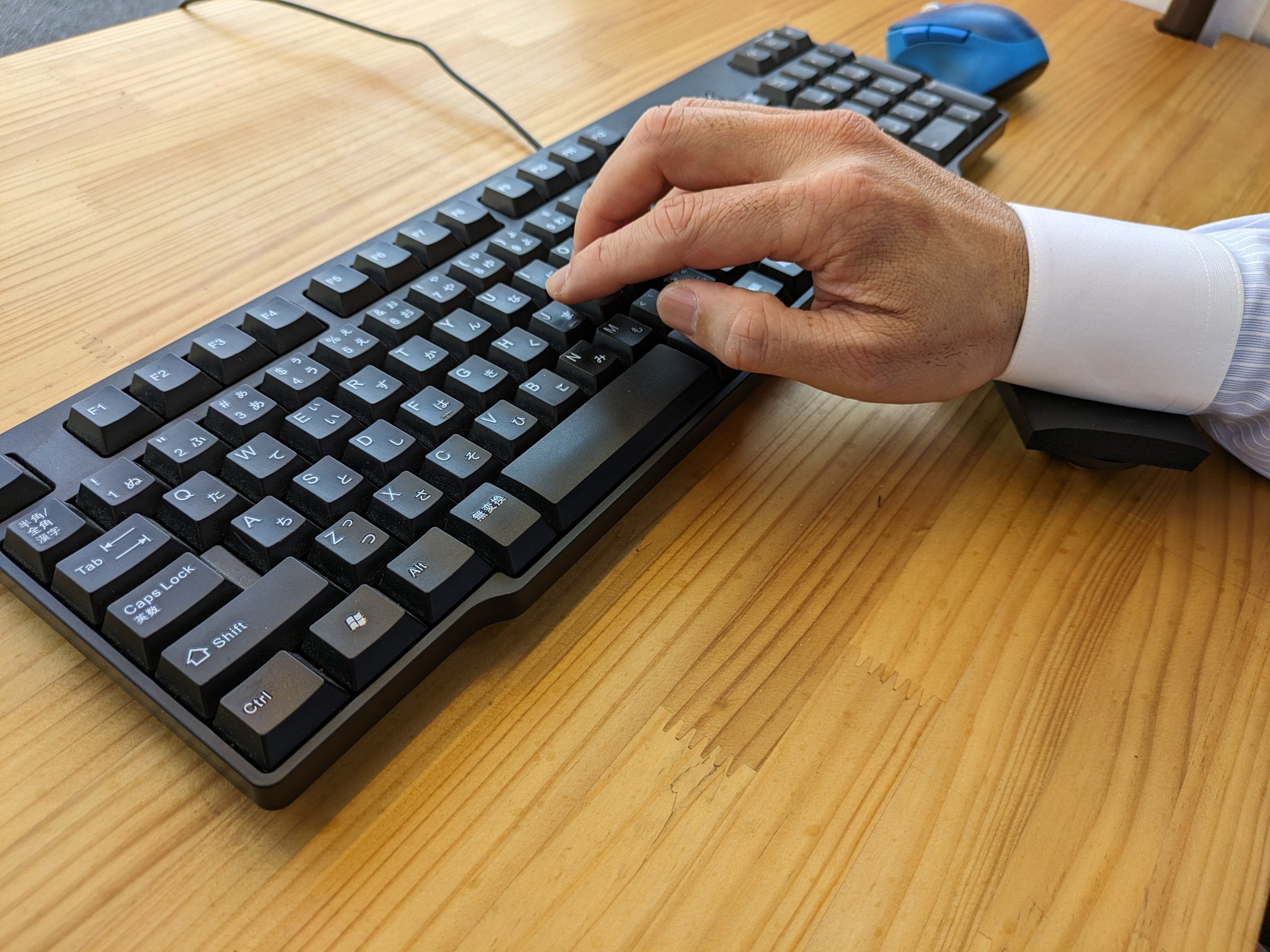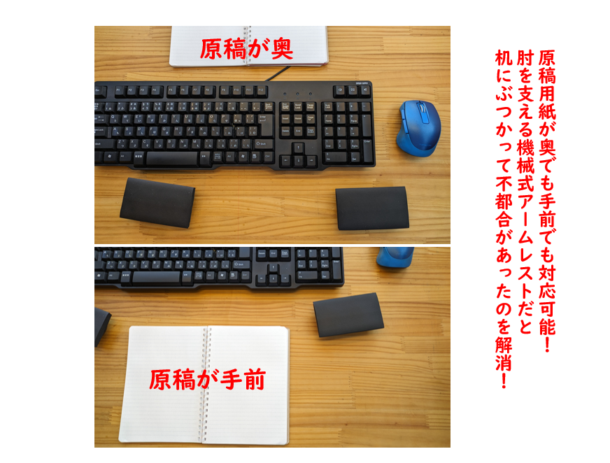 腕を支えてくれるのは良いが、マウスとか遠方のキーを押しに行くときに一瞬手を浮かさないといけないのが、「あと、一工夫ほしい!」と思う点でした。