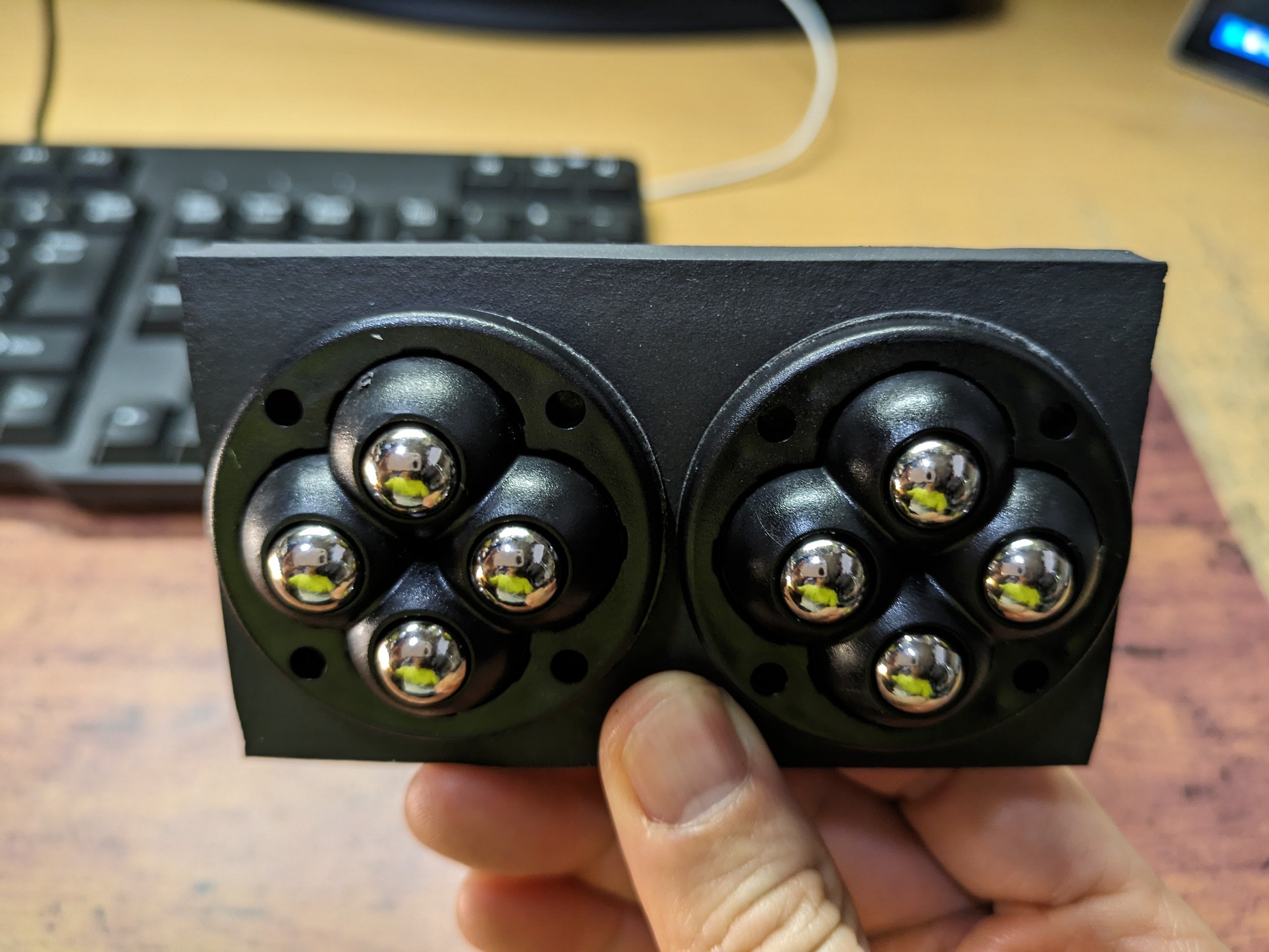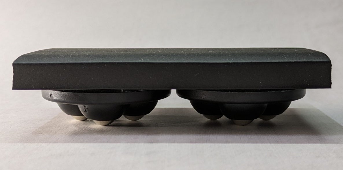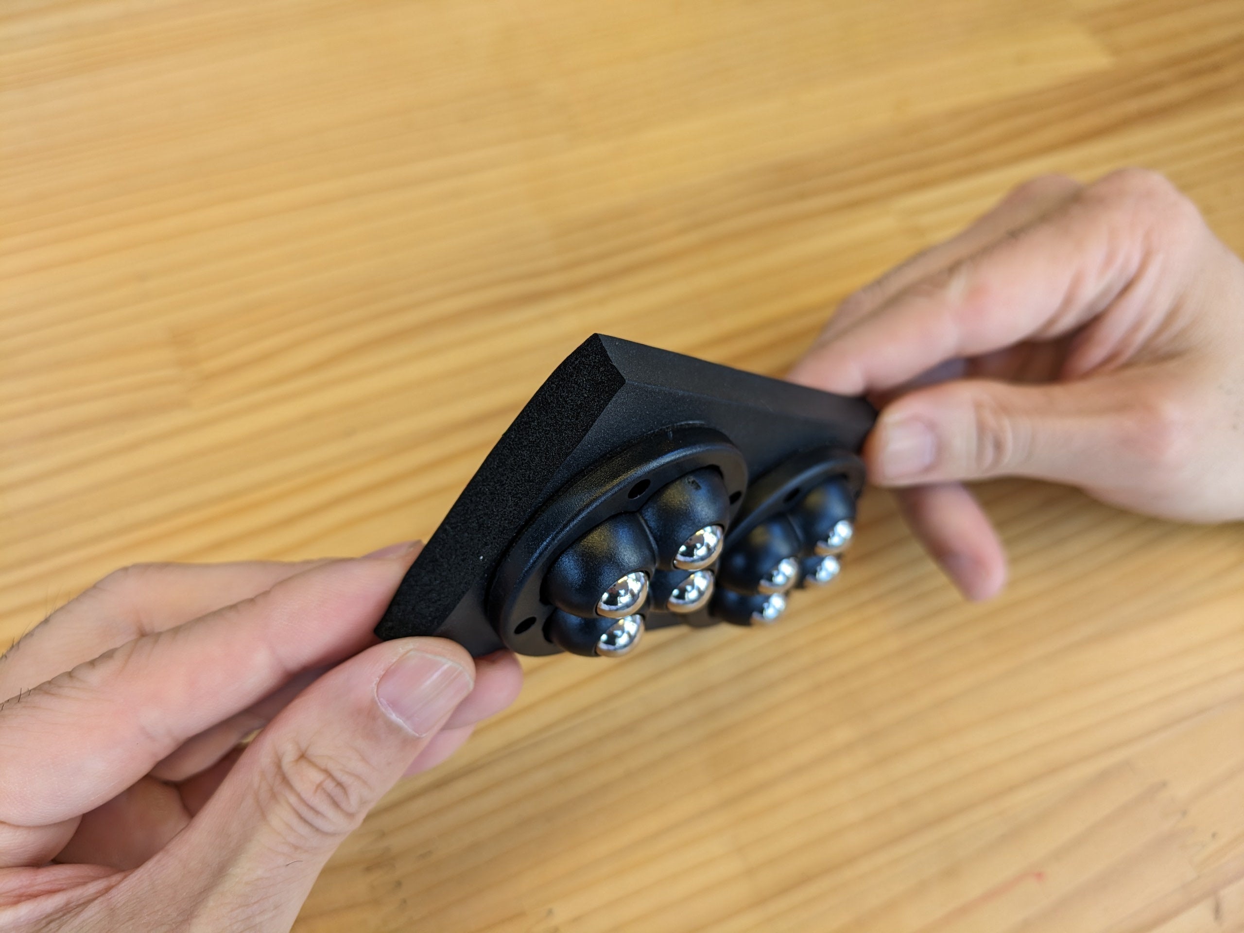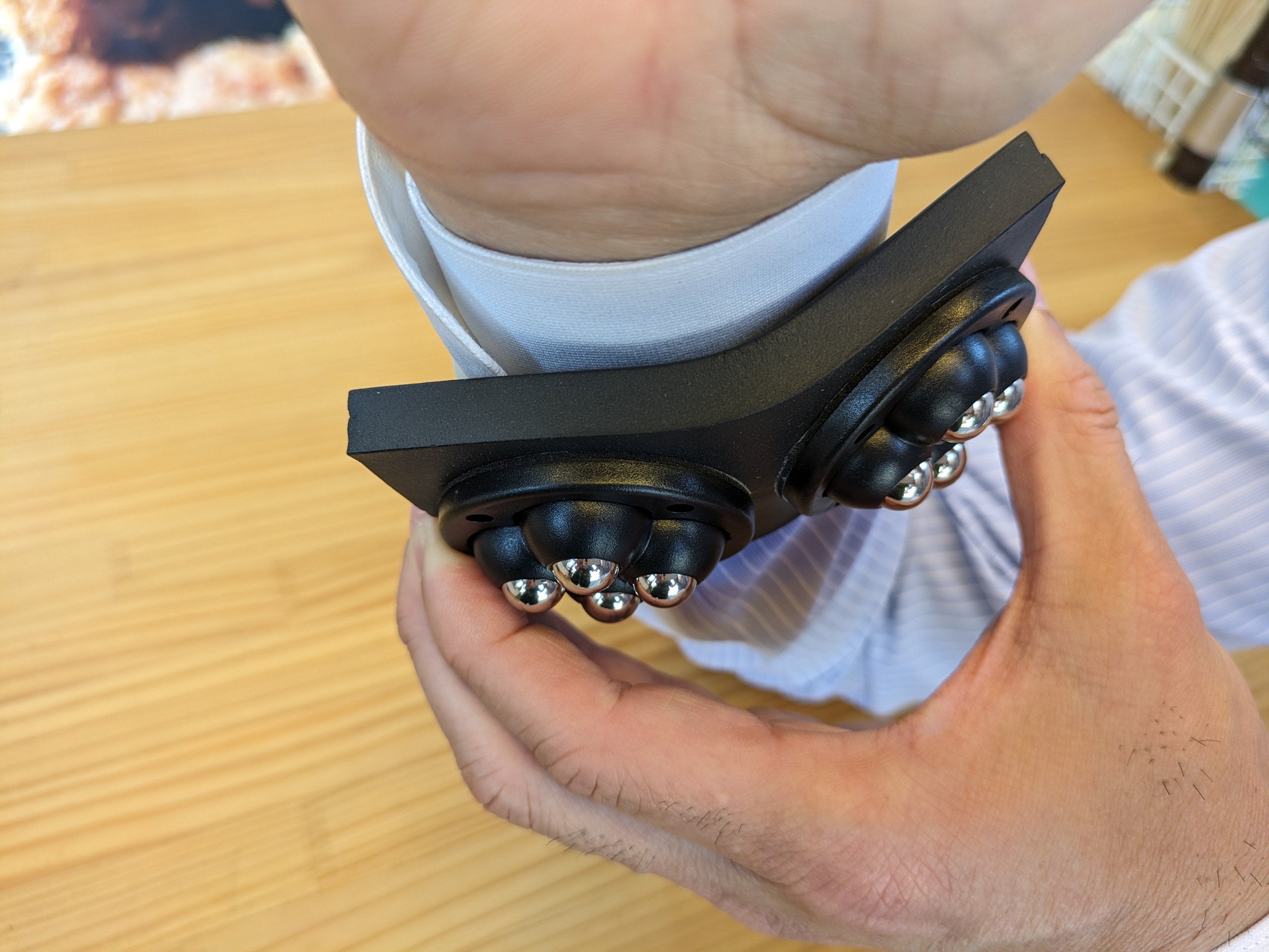 なら、理想的なものを自分で創ろう!と決心しました。車輪ではなく、ボールキャスターを底部に付けた動くアームレスト。動的という英単語であるダイナミックを冠して、『ダイナミックアームレスト』の完成です。