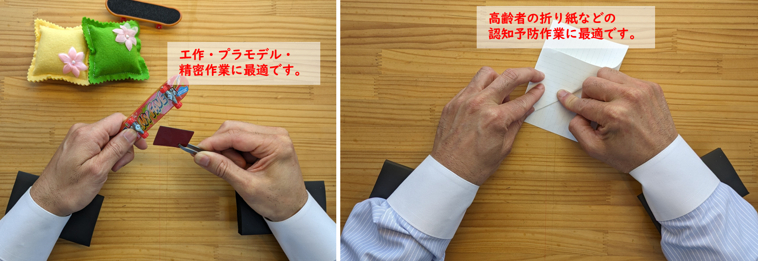 パソコンに長時間向き合う人の為に開発。キーボード・マウス間で腕を浮かせず、アームレストが支えたまま移動してくれます。文章作成、データ入力、ゲーム、手芸、精密作業の人に最適なグッズです。
