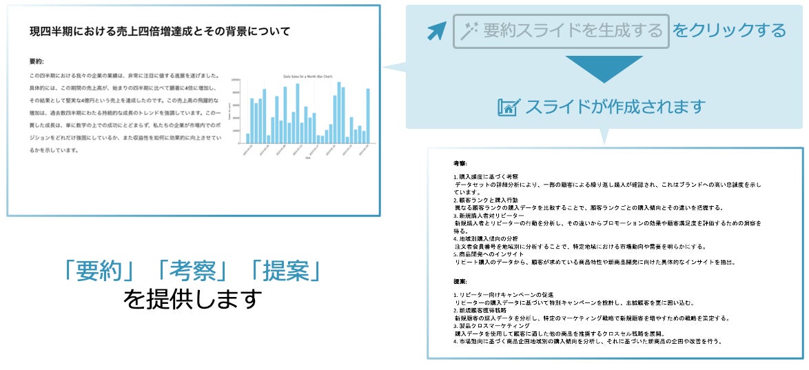 分析結果に対する考察やアクションプラン付きでパワーポイント形式で出力。また、生成したグラフのデータはCSV形式で出力も可能。