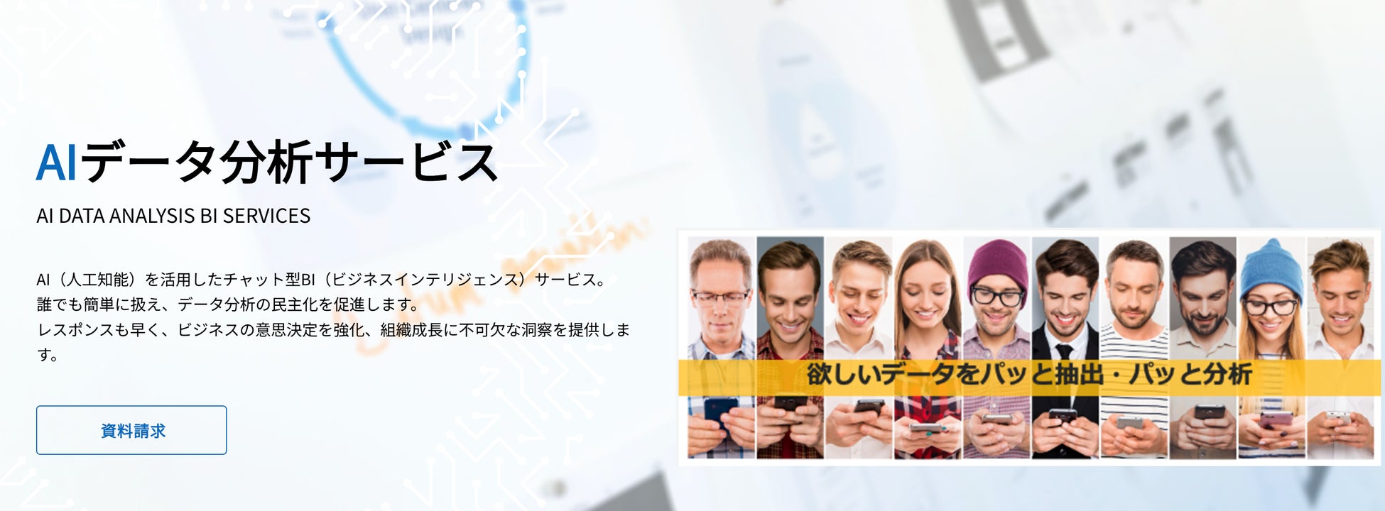 AI(人工知能)を活用したチャット形式のデータ分析サービスです。誰でも簡単に扱え、データ分析の民主化を促進します。ビジネスの意思決定や浸透を強化、経営者から現場スタッフまで横断したデータ活用が可能!