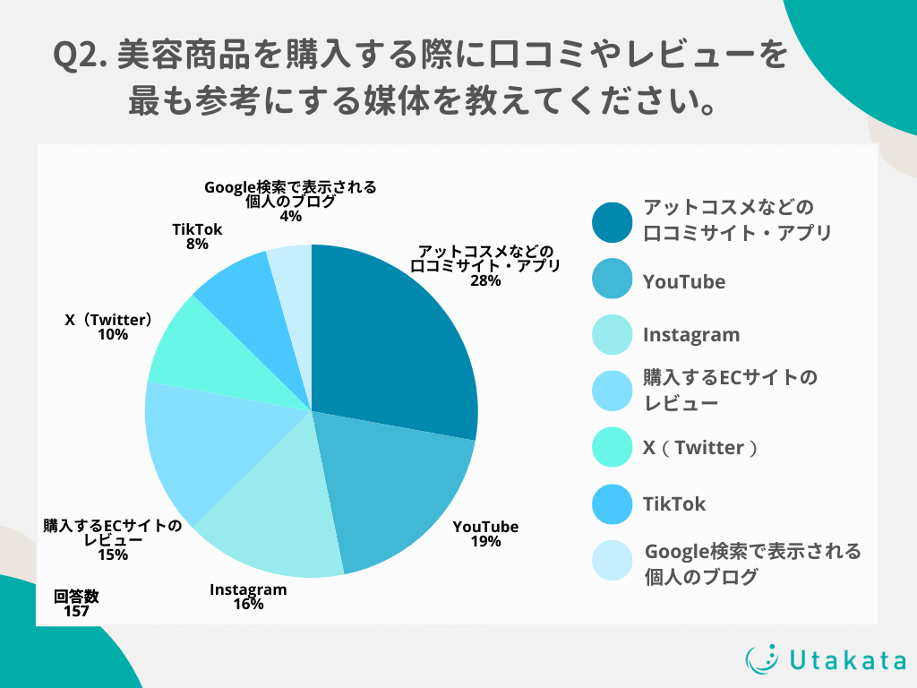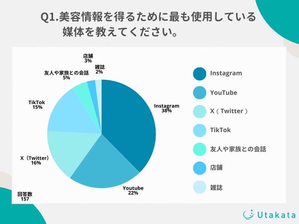 ショート動画SNSの運用やインフルエンサーキャスティングを行っている株式会社Utakata( https://utakata.co.jp/ )は、Z世代(1996年から2012年生まれ)の男女157名を対象に、「美容情報を得るために使用している媒体」に関する調査を実施いたしましたので、お知らせいたします。