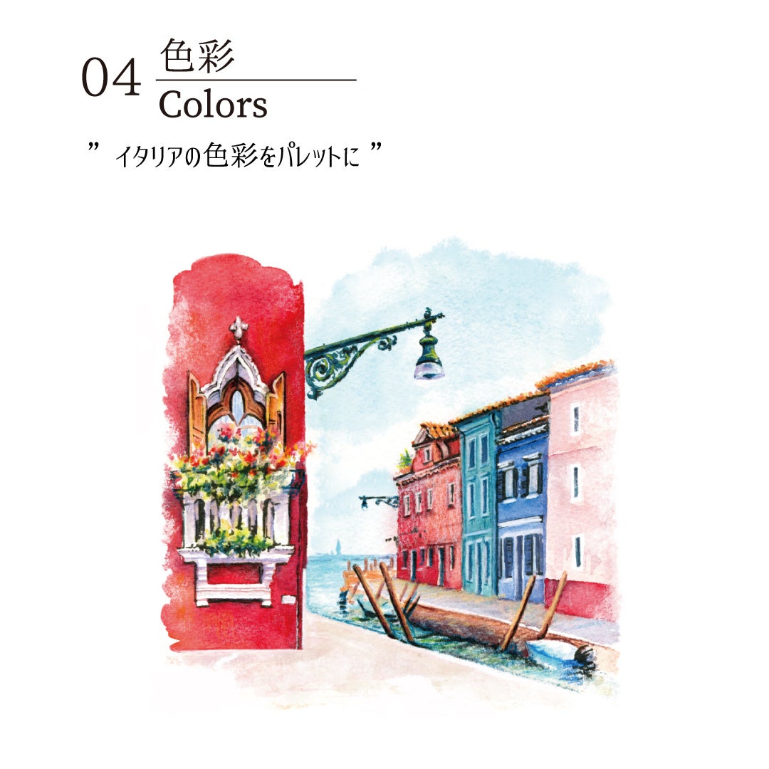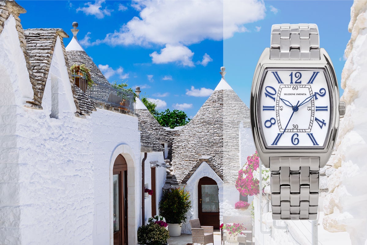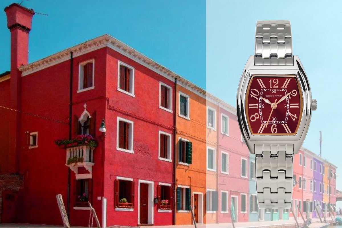 セレジオーネインフィニータに採用した色は特別なものです。針や文字盤に施した様々な色たちのベースにはイタリアの街が在ります。漆黒の文字盤で時を刻む金色の針は、大聖堂から見上げる天井の影と装飾です。白いダイヤルに浮かぶ紺藍の文字符は、地中海に浮かぶ積雲と狭間から覗く空のコントラストです。鮮やかな臙脂色は、100を超える島から成るヴェネツィアのブラーノ島に建つ古民家の壁の色かもしれません。時計に施されたカラーリングを愉しみながら、色のルーツに想いを馳せて下さい。