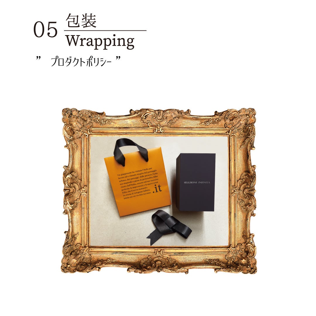 彼らが選んだ額に作品が入り美術館で展示品として完成するように製品を収納する「化粧箱」や、それを携える「手提げ袋」もセレジオーネインフィニータは製品の一部であると考え大切にしています。