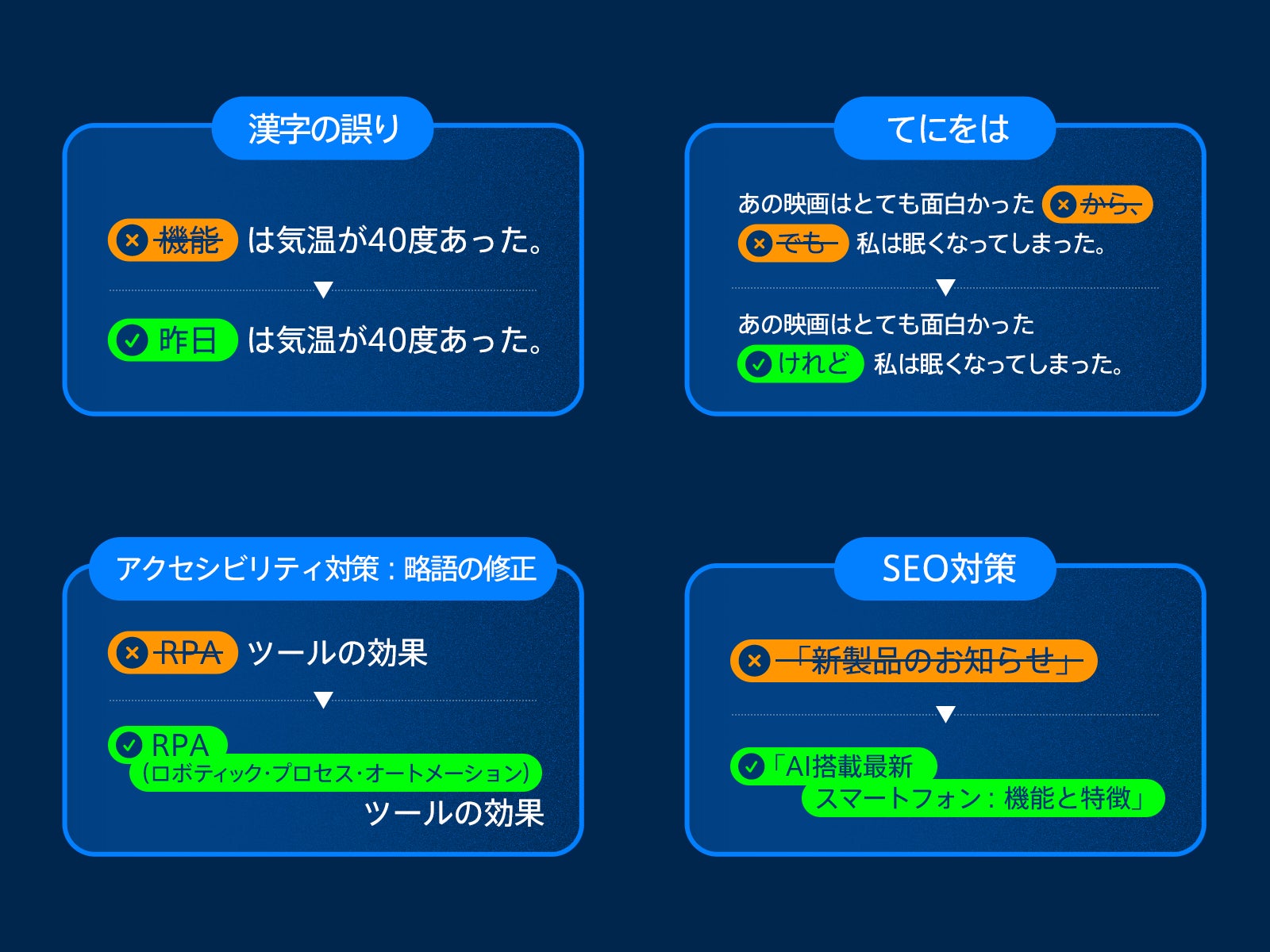 コンテンツ中の誤字脱字を迅速かつ正確に検出し文脈を考慮した修正を自動で行います。