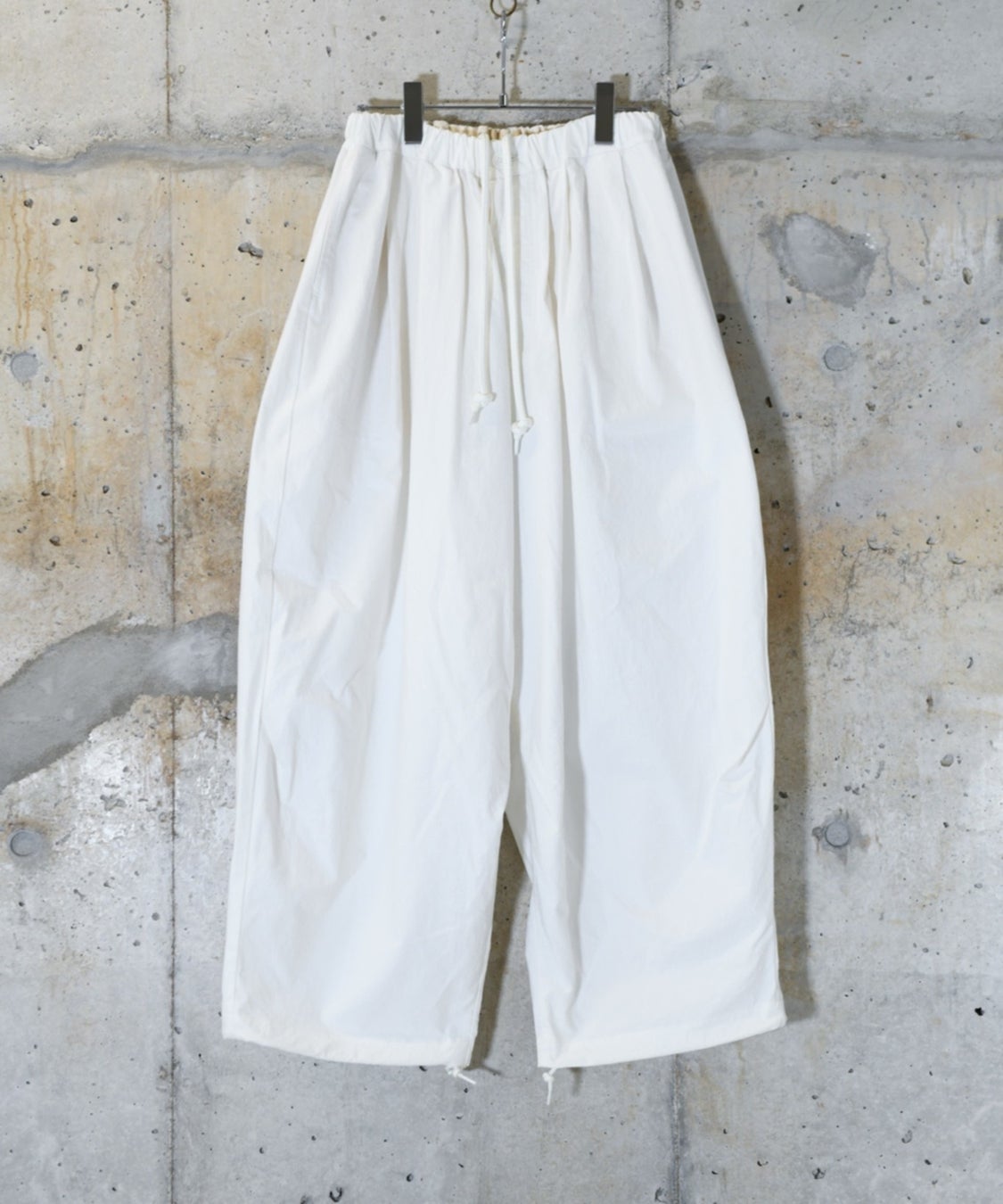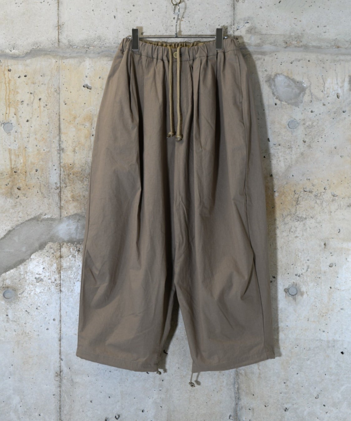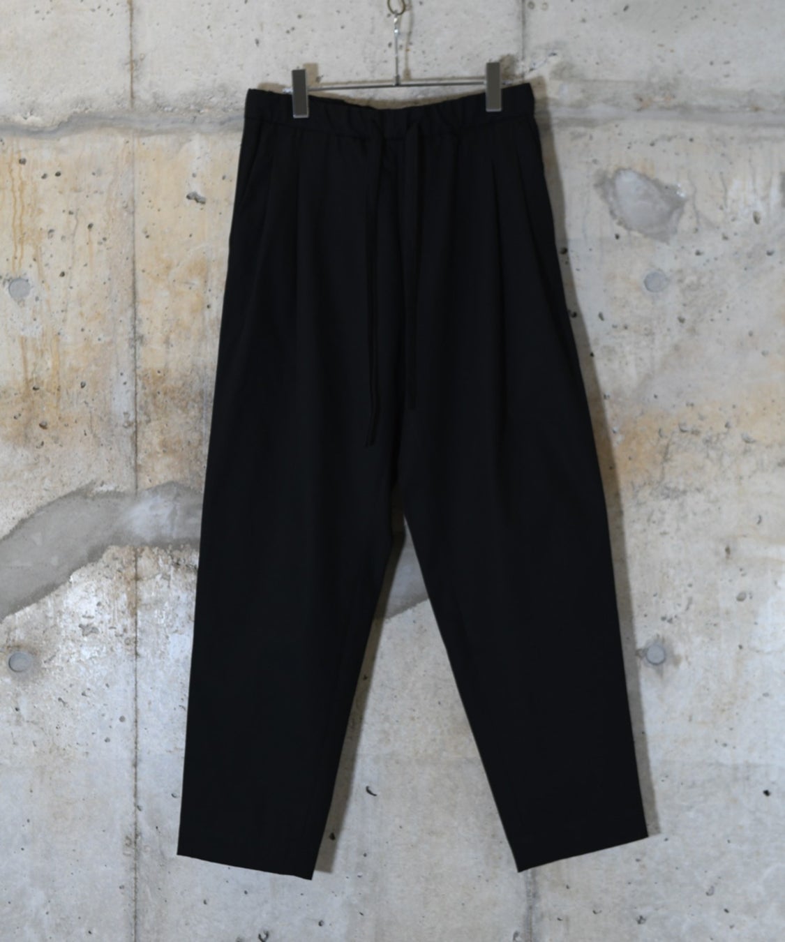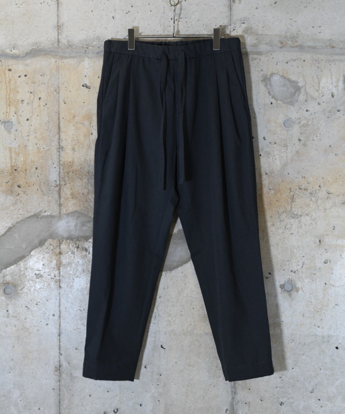 コットンポリエステルに特殊な加工を施した生地。 その特有のドレープ性を活かし、 ドレッシーでありながらリラックスしたイージートラウザースに仕上げています。