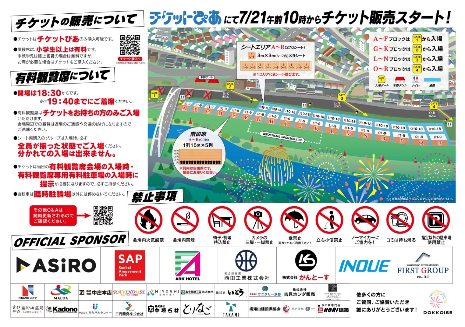 主催は福知山HANABI実行委員会で、地元の若手経営者が設立した一般社団法人DOKKOISEが中心となり、福知山観光協会や地元の商店街とで結成。福知山市後援のもと、安全を最優先におこなうため、観覧エリアと露店エリアを限定して開催します。