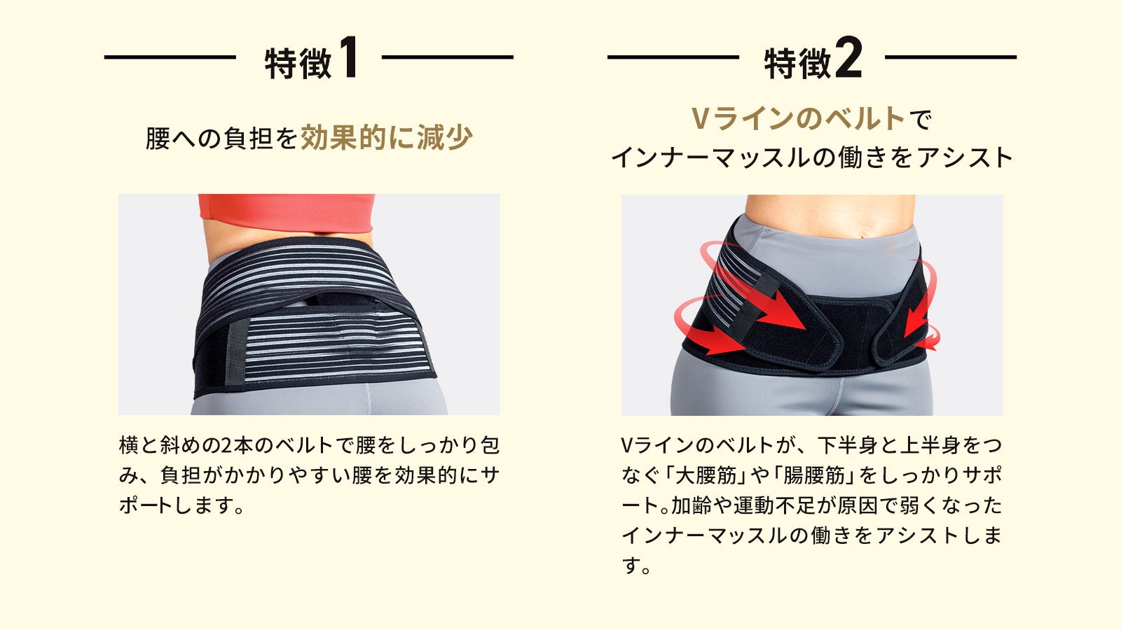 『STYLE ARTIST BELT CORE』は、横と斜めの2本のベルトで腰をしっかり包み、負担がかかりやすい腰を効果的にサポート。腰への負担を効果的に減少させることができます。また、2本のうちの上のVラインのベルトが、上半身と下半身をつなぐ「大腰筋」や「腸腰筋」をしっかりサポート。加齢や運動不足が原因で弱くなったインナーマッスルの働きをアシストします。