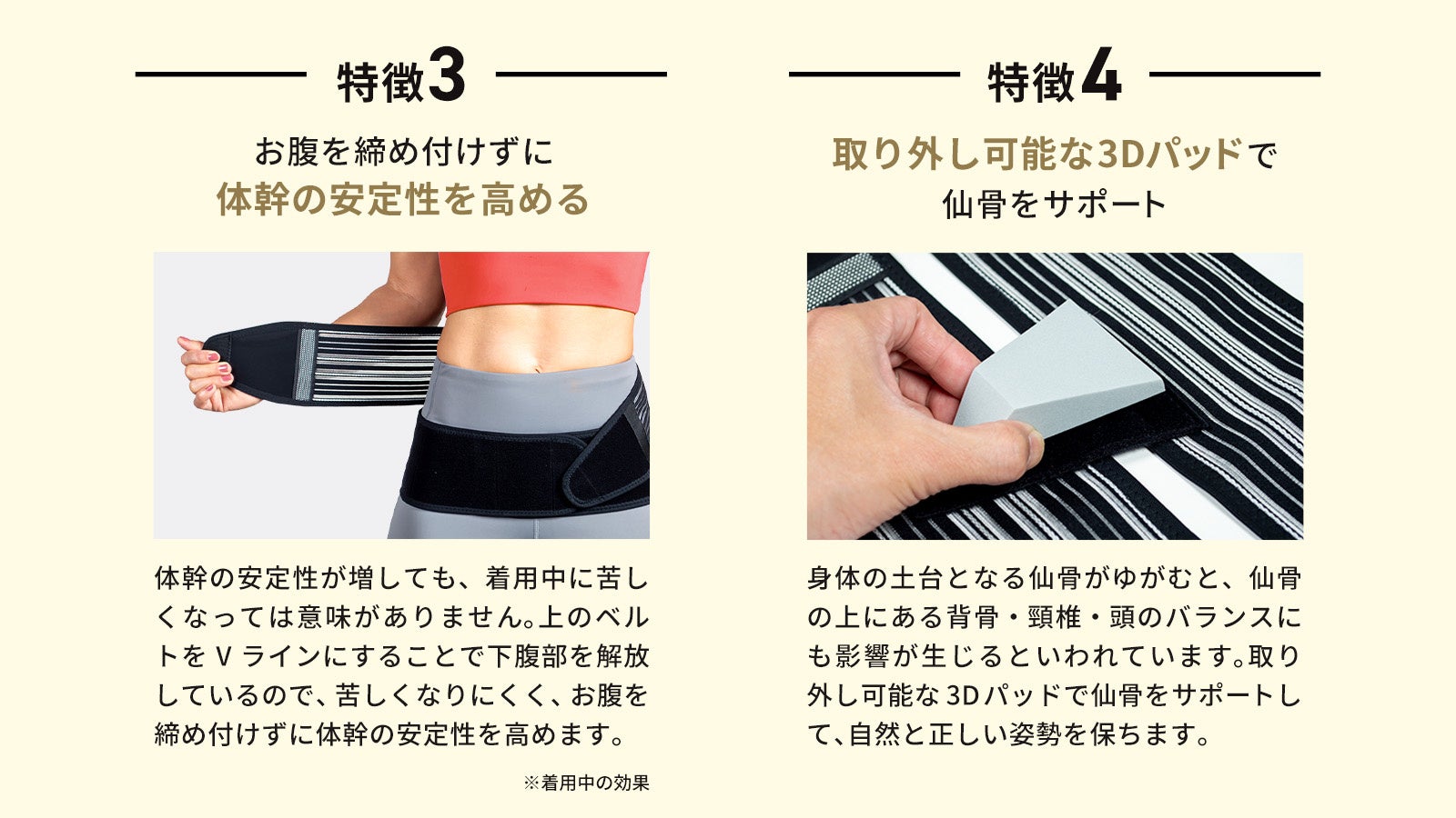 体幹の安定性が増しても、着用中に苦しくなっては長時間着けることができず、着用する意味がありません。『STYLE ARTIST BELT CORE』は、2本のうちの上のベルトが、Vラインになっていることでお腹の部分の圧迫を解消。着用中も苦しくなりにくく、お腹を締め付けずに体幹の安定性を高めます。