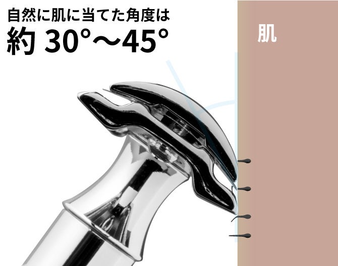 カミソリヘッドを30~45度に傾けることで、理想的な剃り心地を実現しています。刃の手前に凹凸型の丸み設計を施すことで、皮膚の下ではなく皮膚レベルでカットし、皮膚を傷つけづらくしながらも深剃りが可能です。また、特殊設計により目詰まりしづらく、快適な髭剃りを楽しめます。