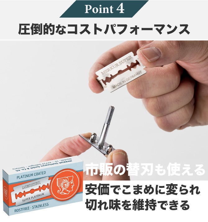 MERKUR34C 2.0モデルは市販の安価な両刃を使用できるため、替刃のランニングコストが非常に低く抑えられます。1枚約50円の替刃を使用した場合、1日あたりのコストは約7円程度です。また、刃の交換やお手入れも簡単に行えるため、長期的に使用することができ、環境にも優しいサスティナブルな製品となっています。