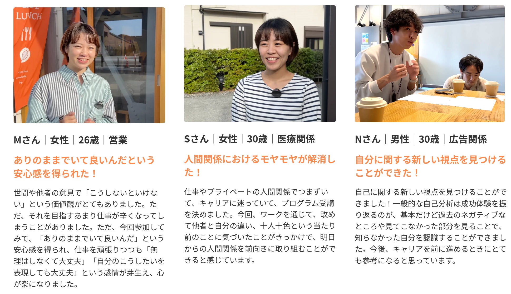本プログラムには「人生を前に進めたいけど、なんかモヤモヤして進めない..」と同じ悩みを持つ方達が集まります。そんな環境で本気で自分に向き合う体験をすることで、自分一人では分からなかった、本当に自分に気づくことができます。