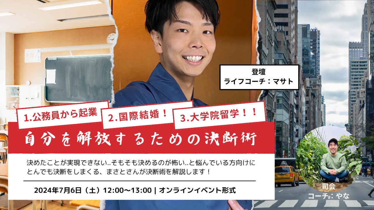 オンライン形式でライフコーチ兼英語コーチ兼経営者として活躍する、まさとさんと共同で「決断」をテーマにしたイベントを開催します。
