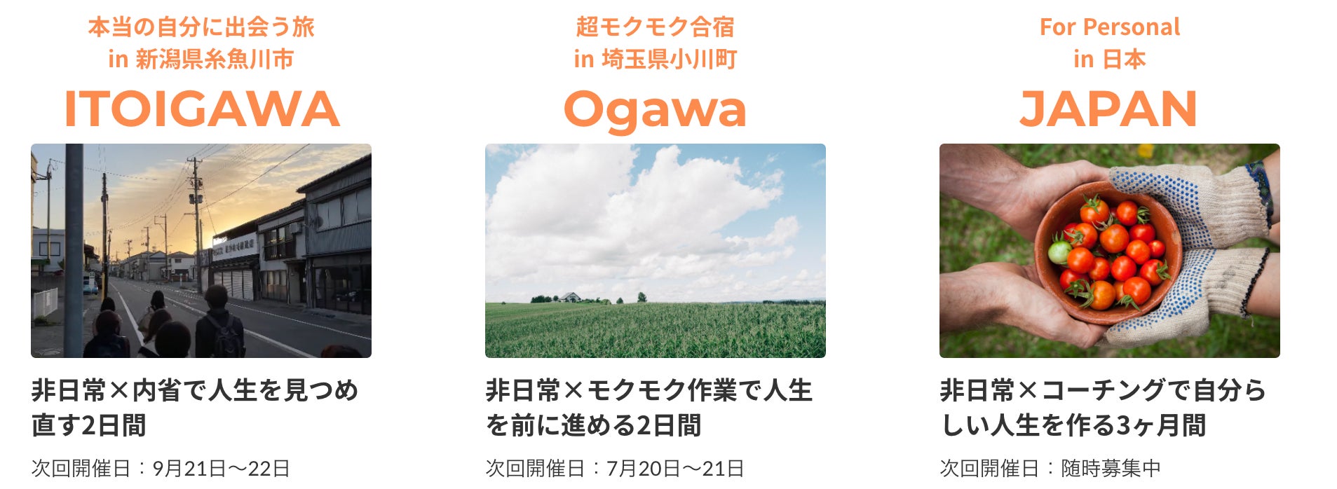 本プログラムでは、参加者様同士だけでなく、施設や食事を提供いただくお店の皆様との対話のチャンスがあります。あえて都会とは違う離れた場所で働くことを決めた人達。彼らの生き方、商品に触れることで、自分の中にある「どう、生きたいか?」と素直に対話することができます。